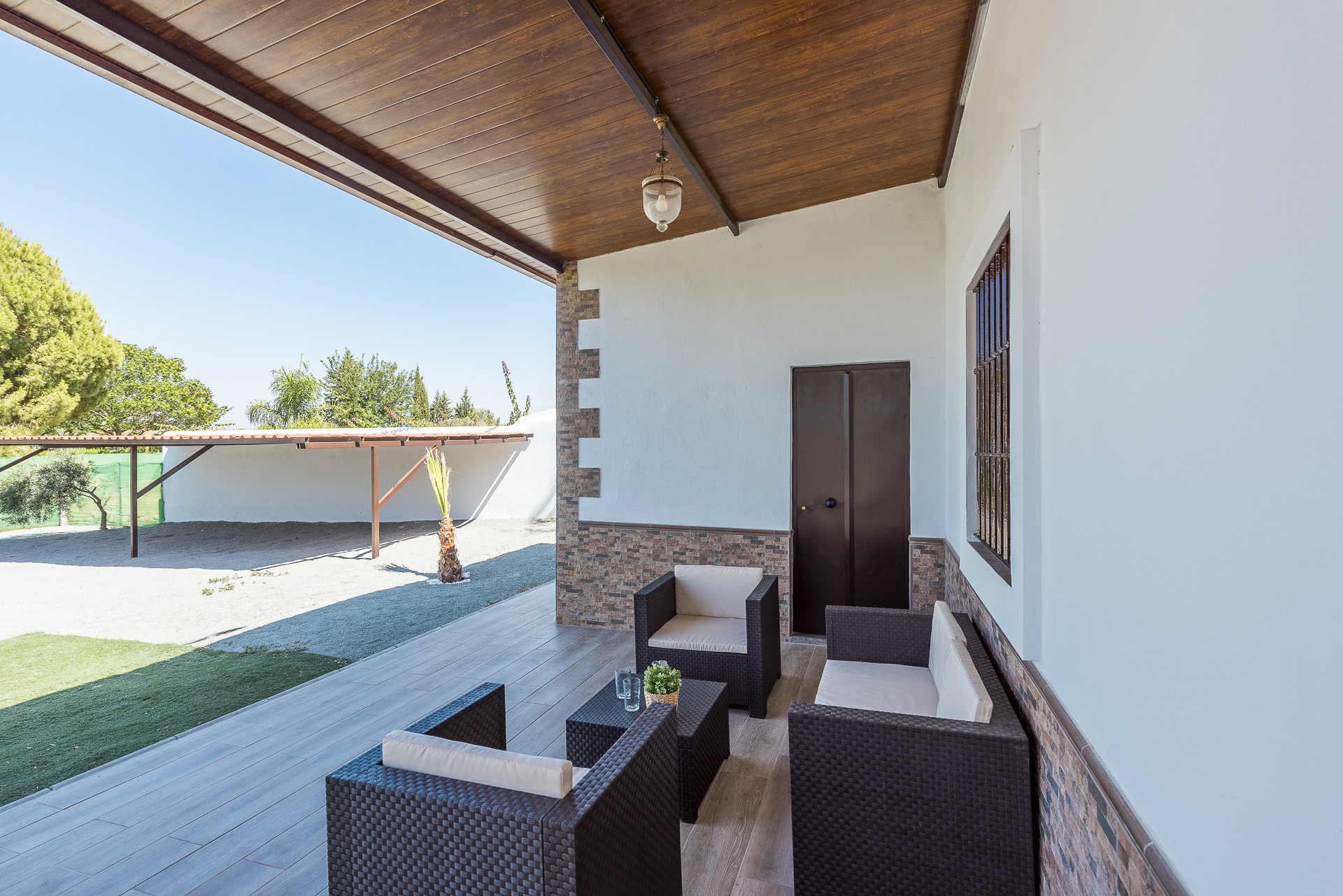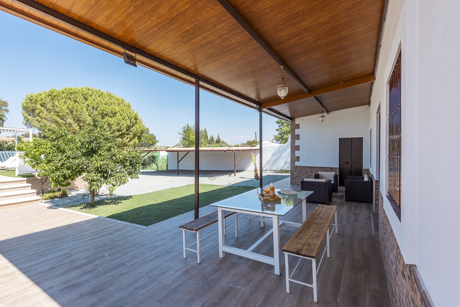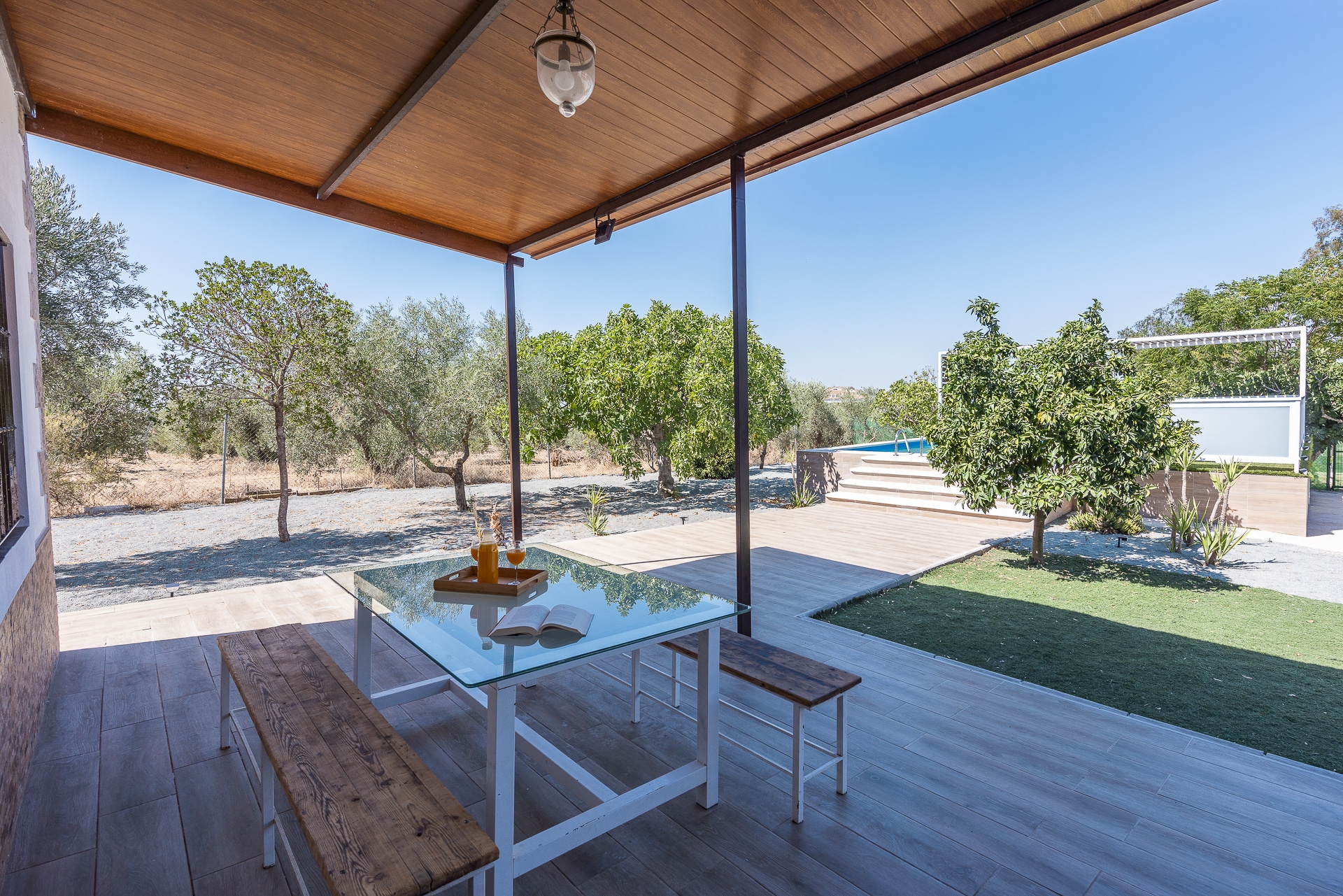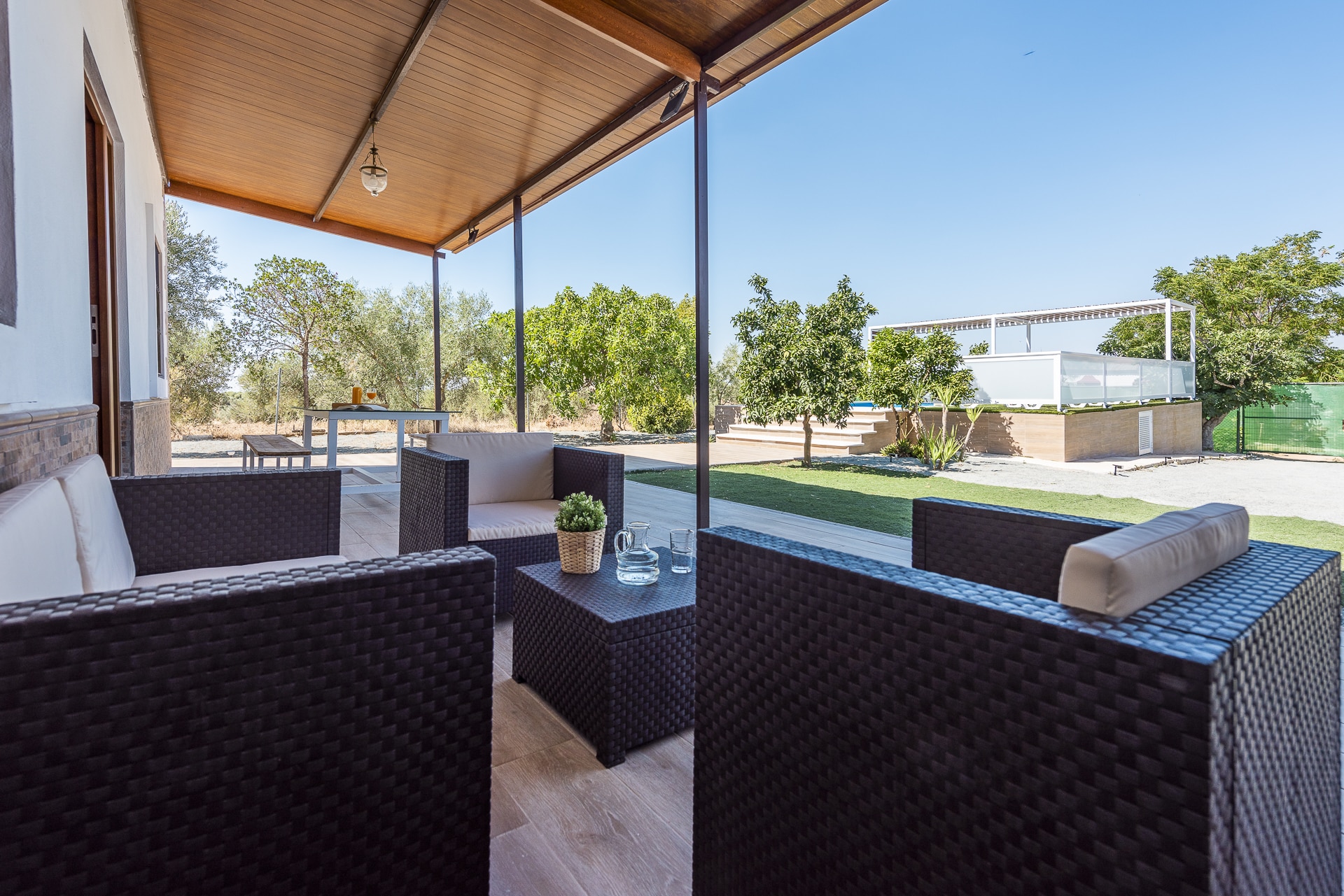 Terraza exterior con porche mirando hacia la piscina