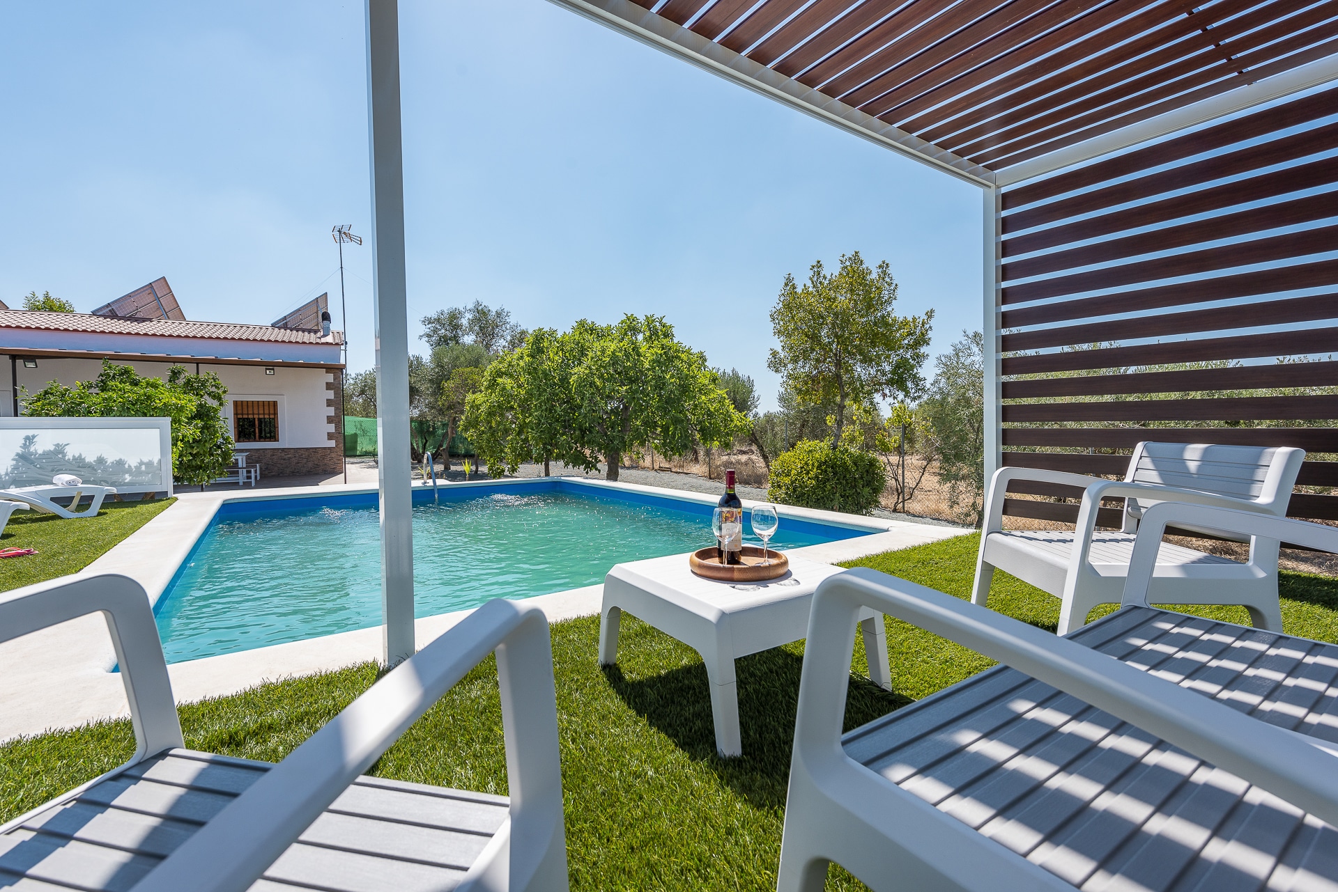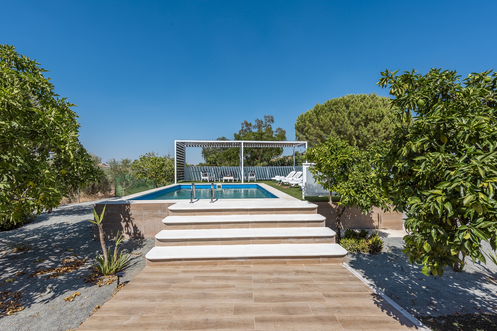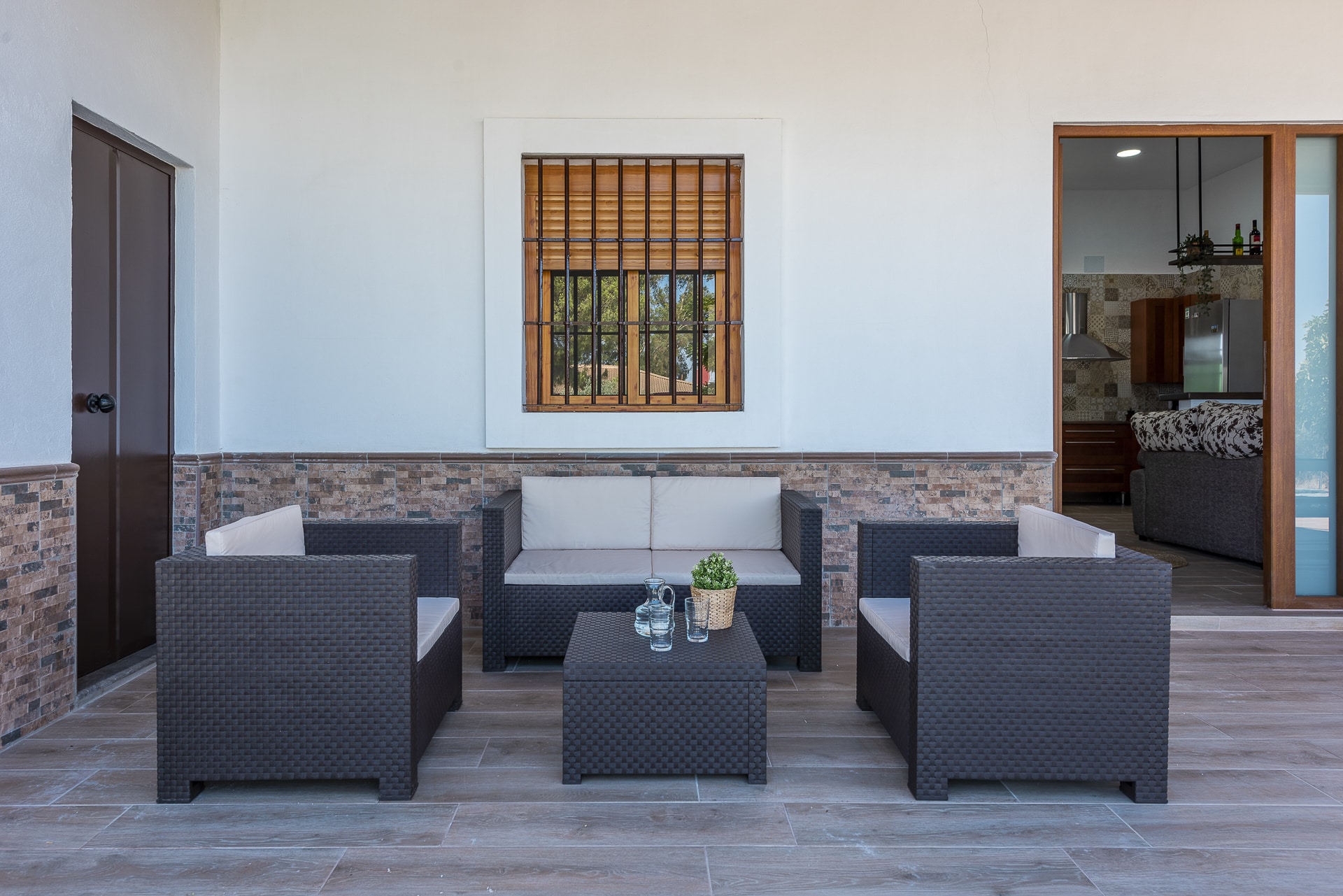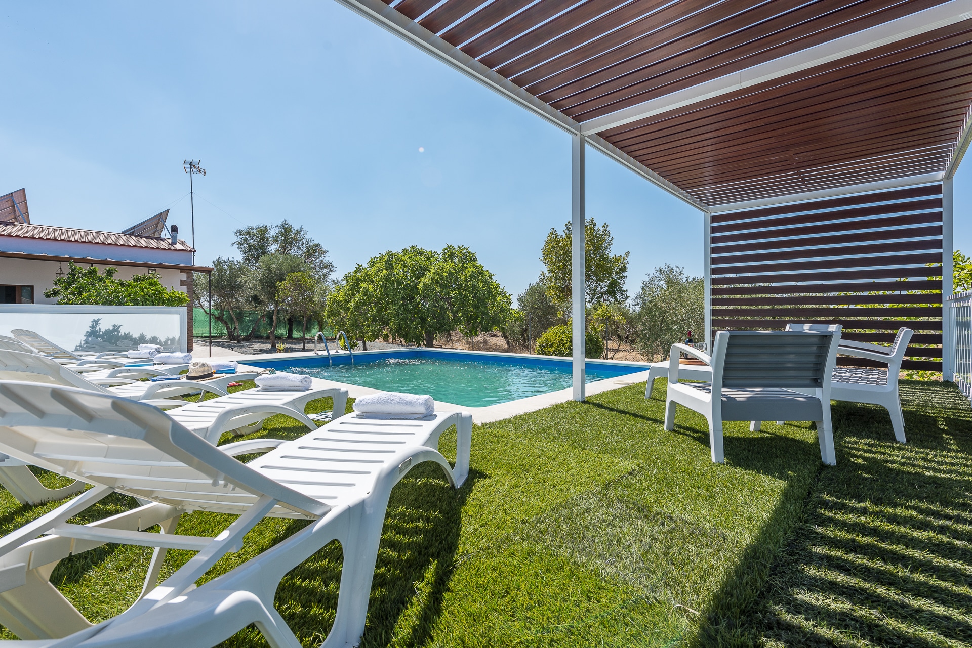 Terraza exterior con porche mirando hacia la piscina
