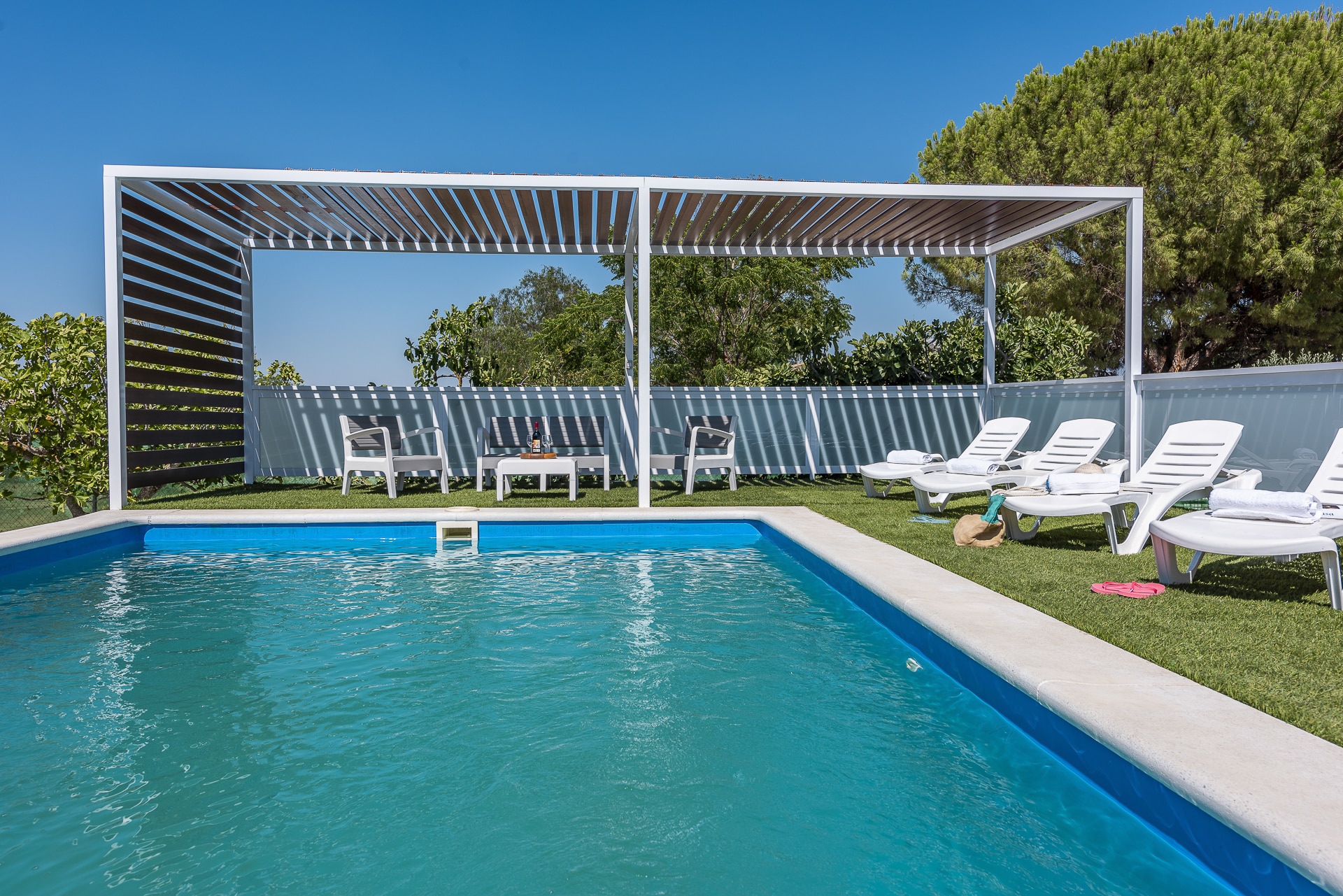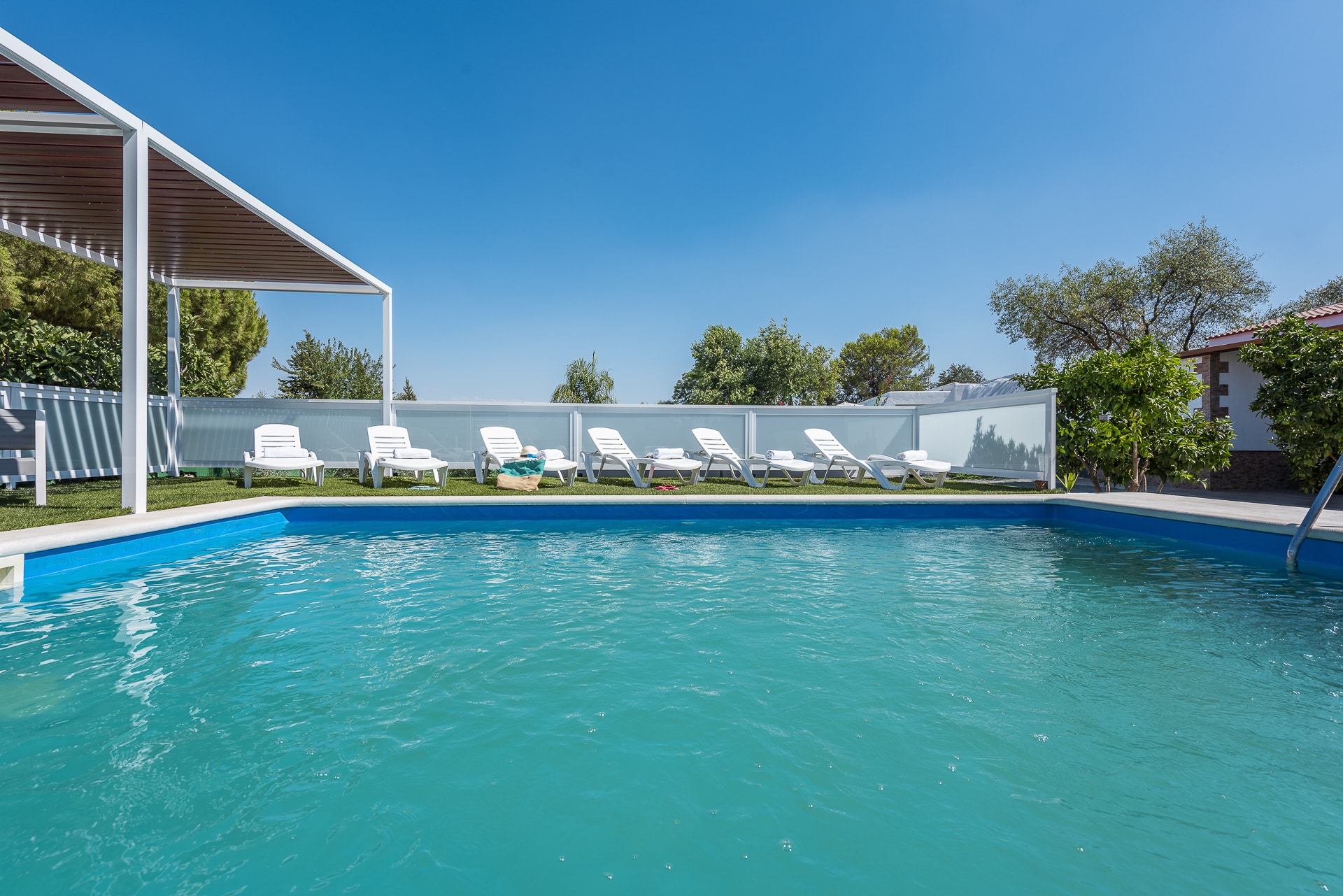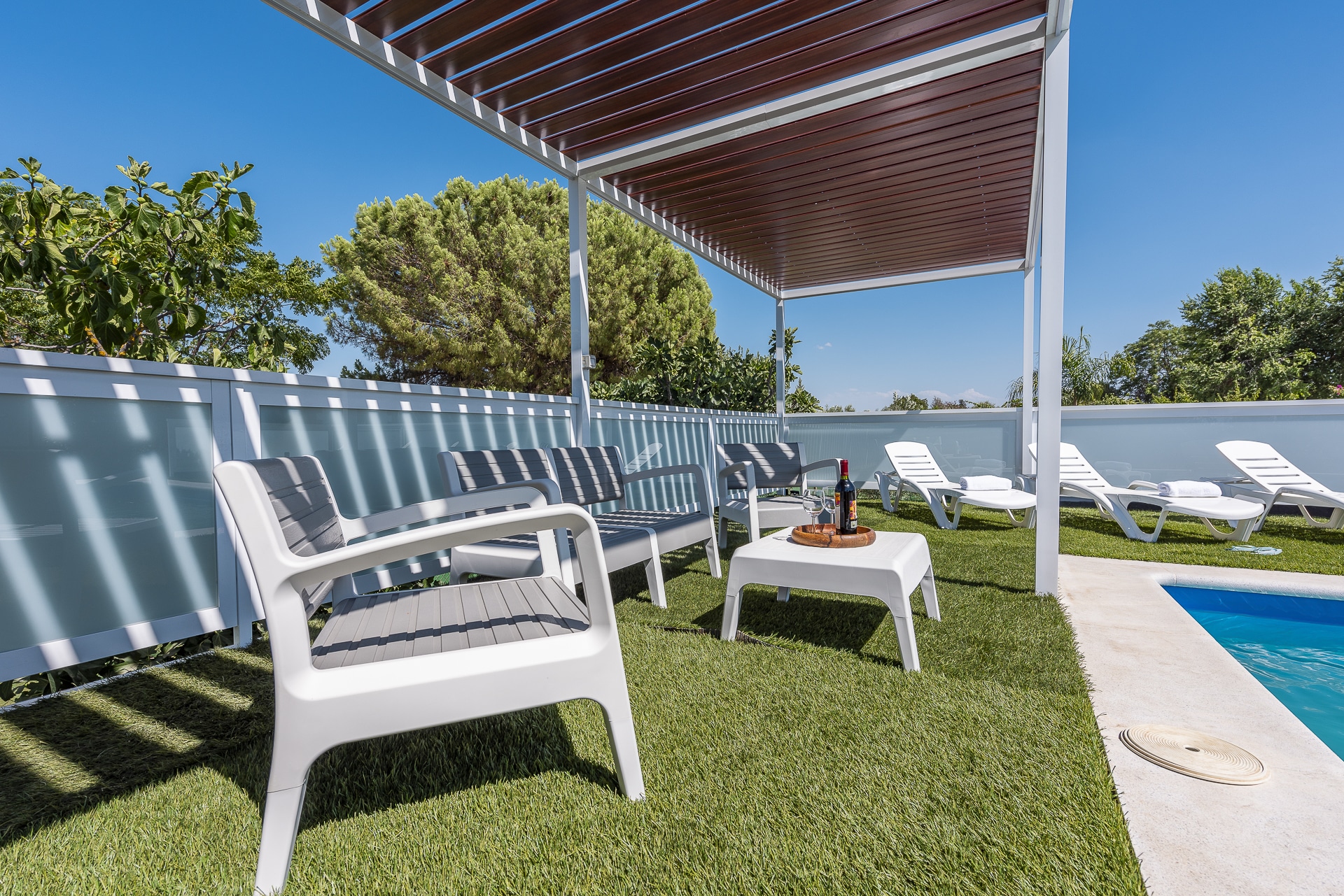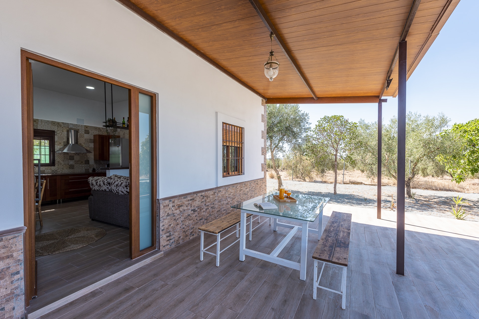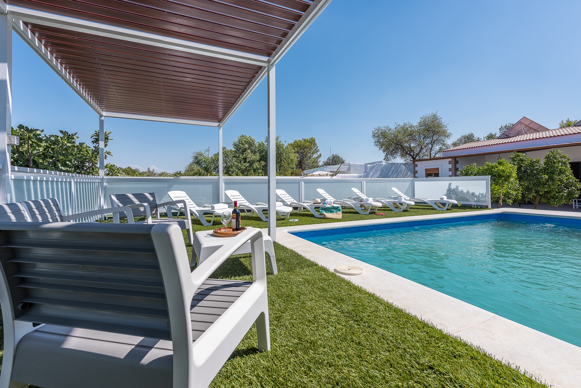 Terraza exterior con porche mirando hacia la piscina