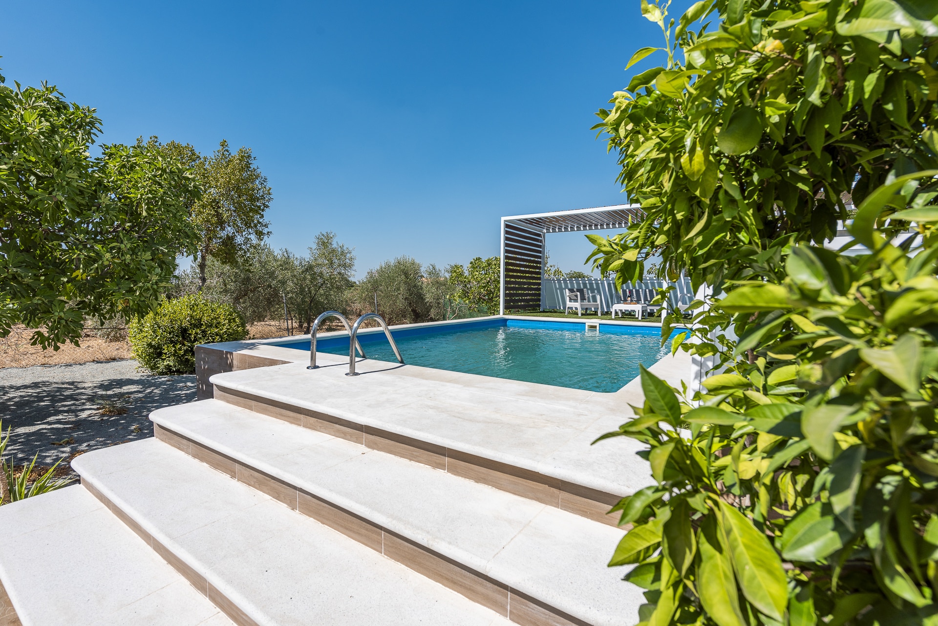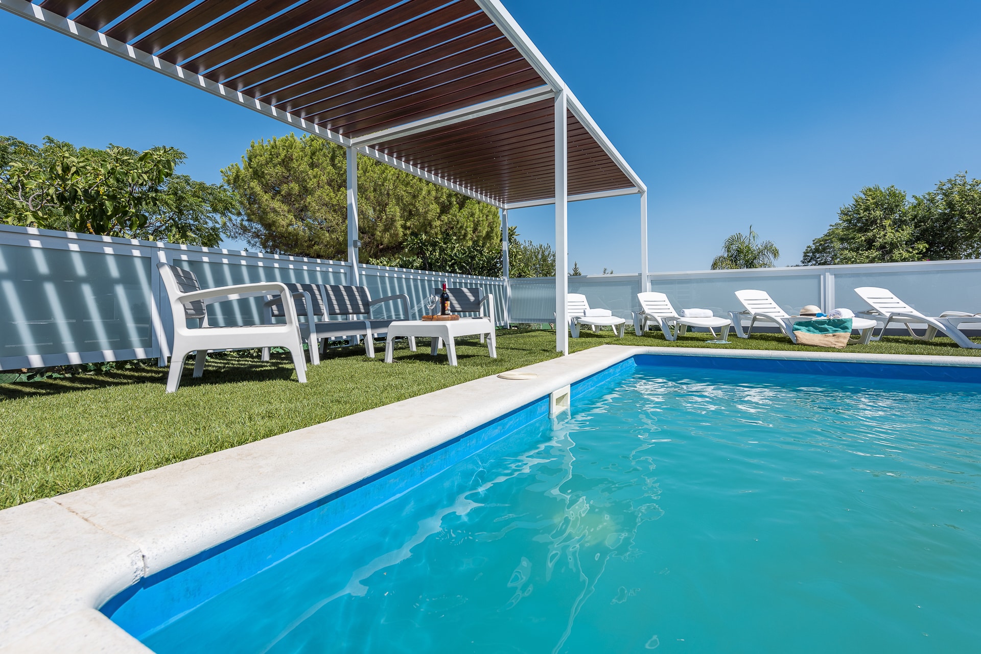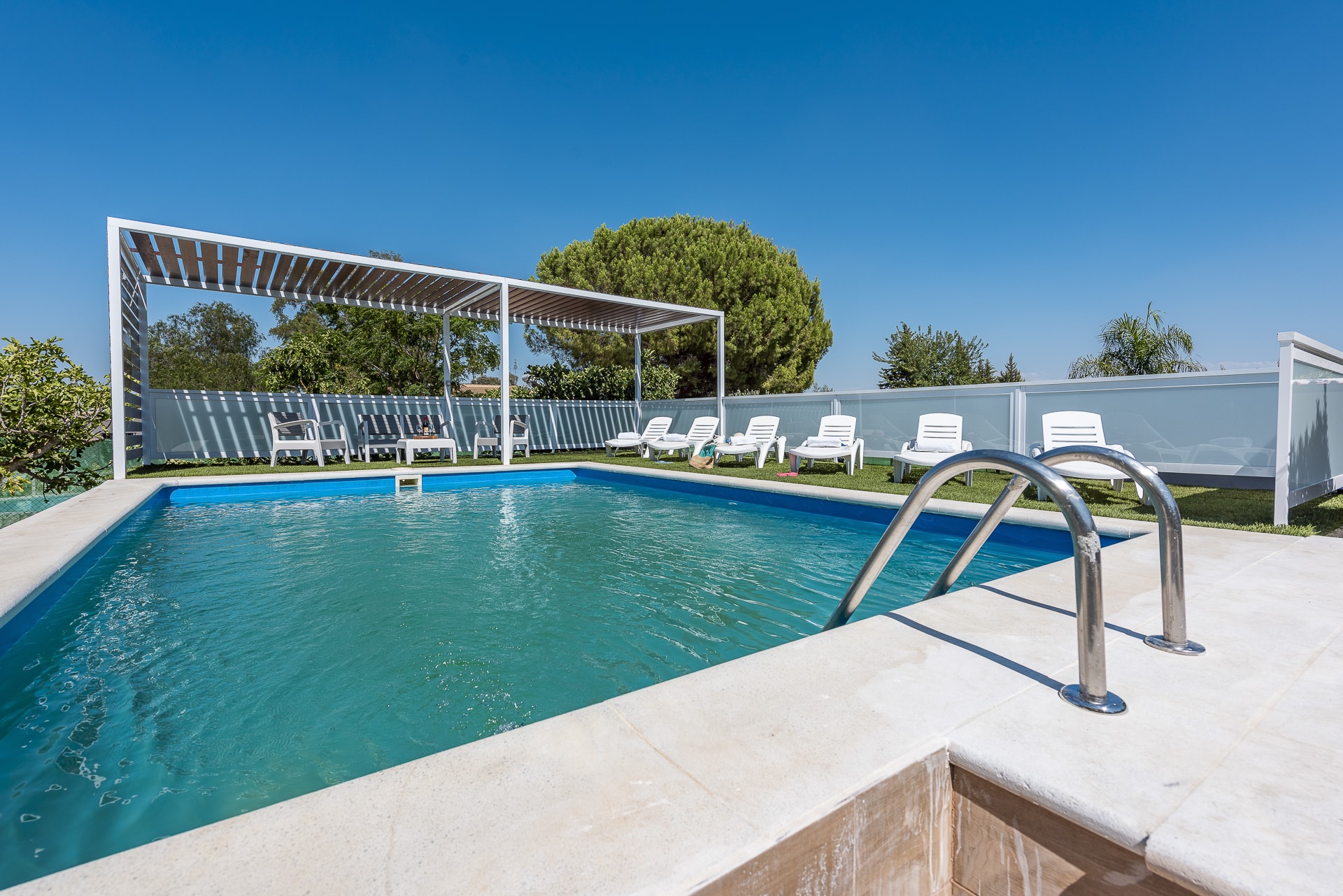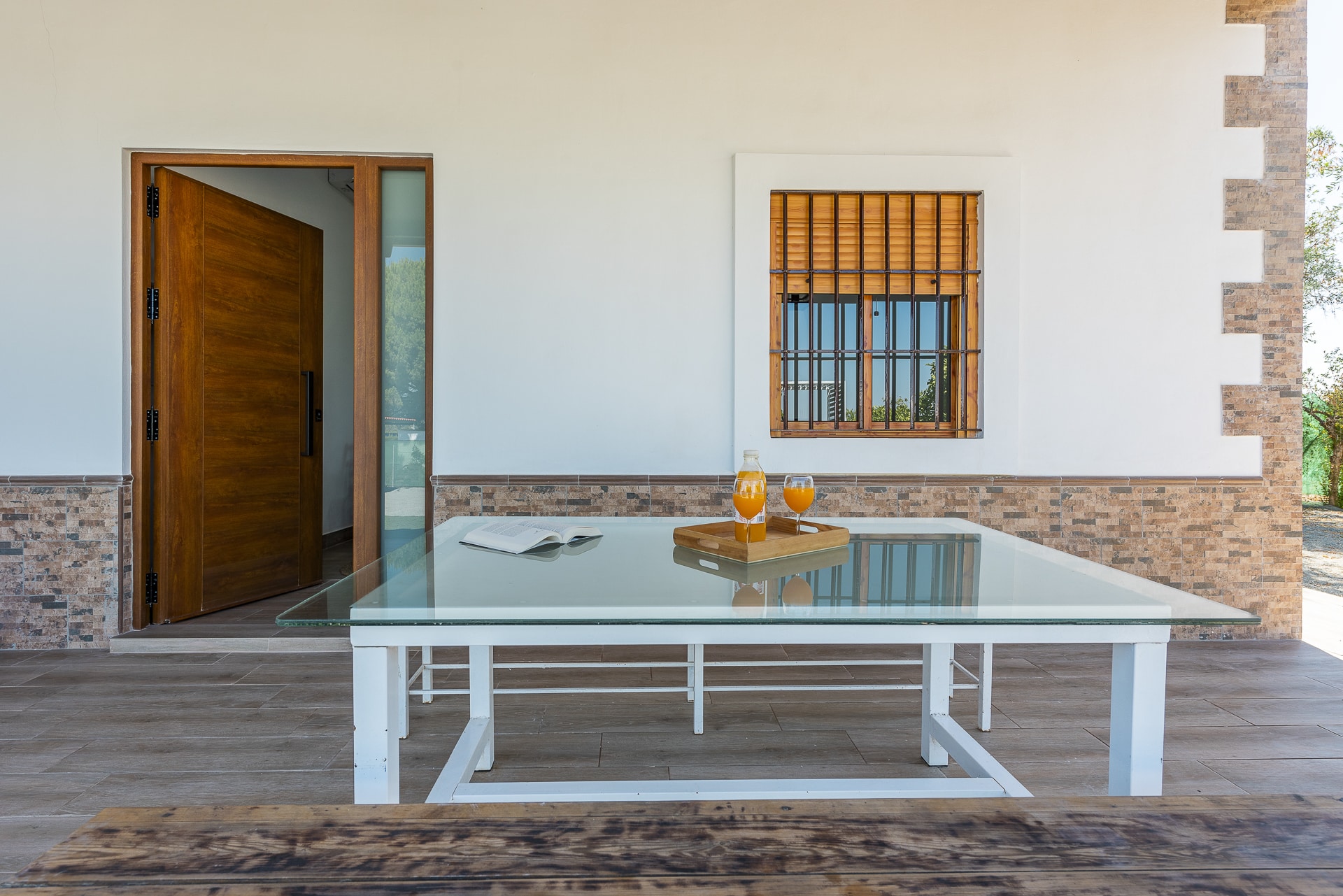 Terraza exterior con porche mirando hacia la piscina