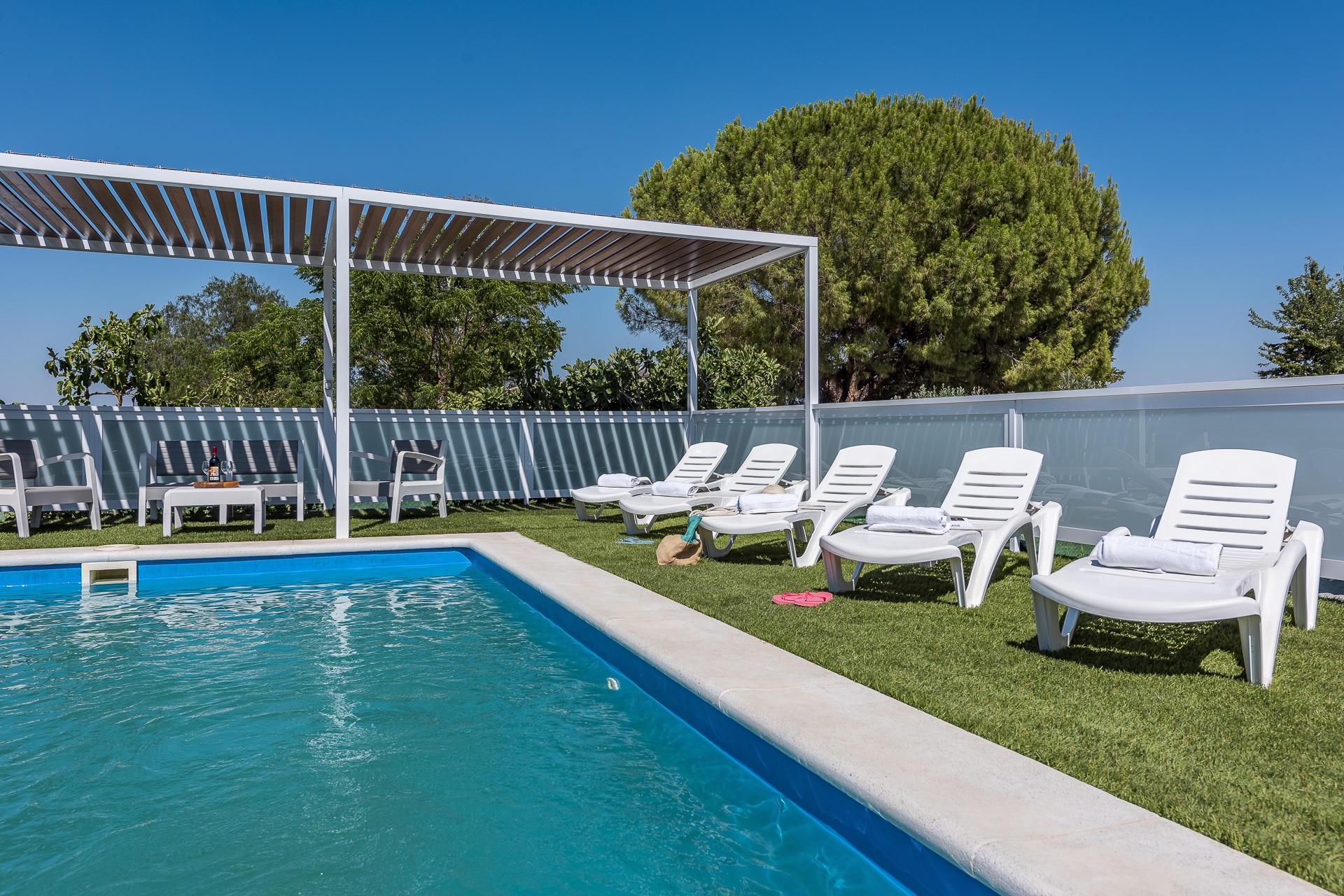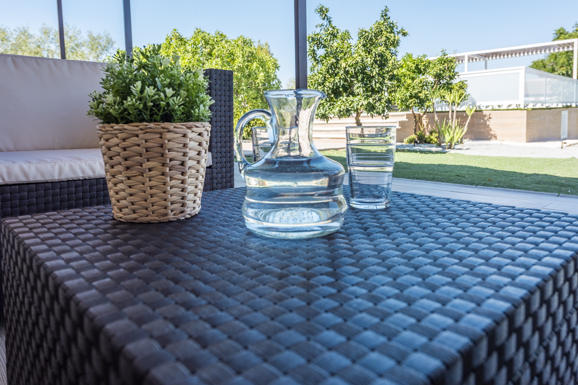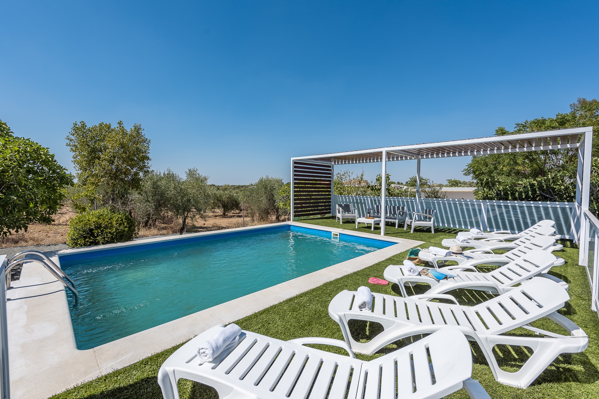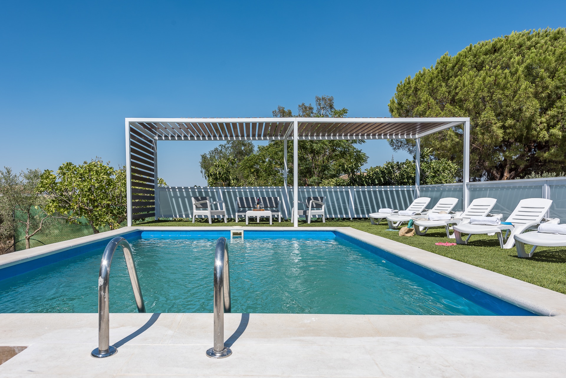 Terraza exterior con porche mirando hacia la piscina