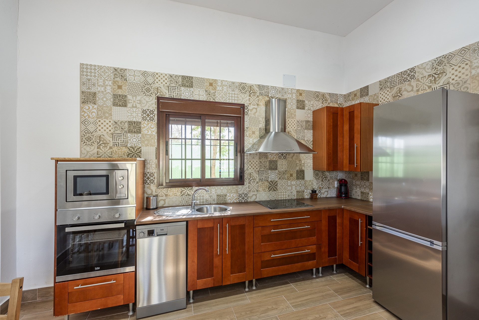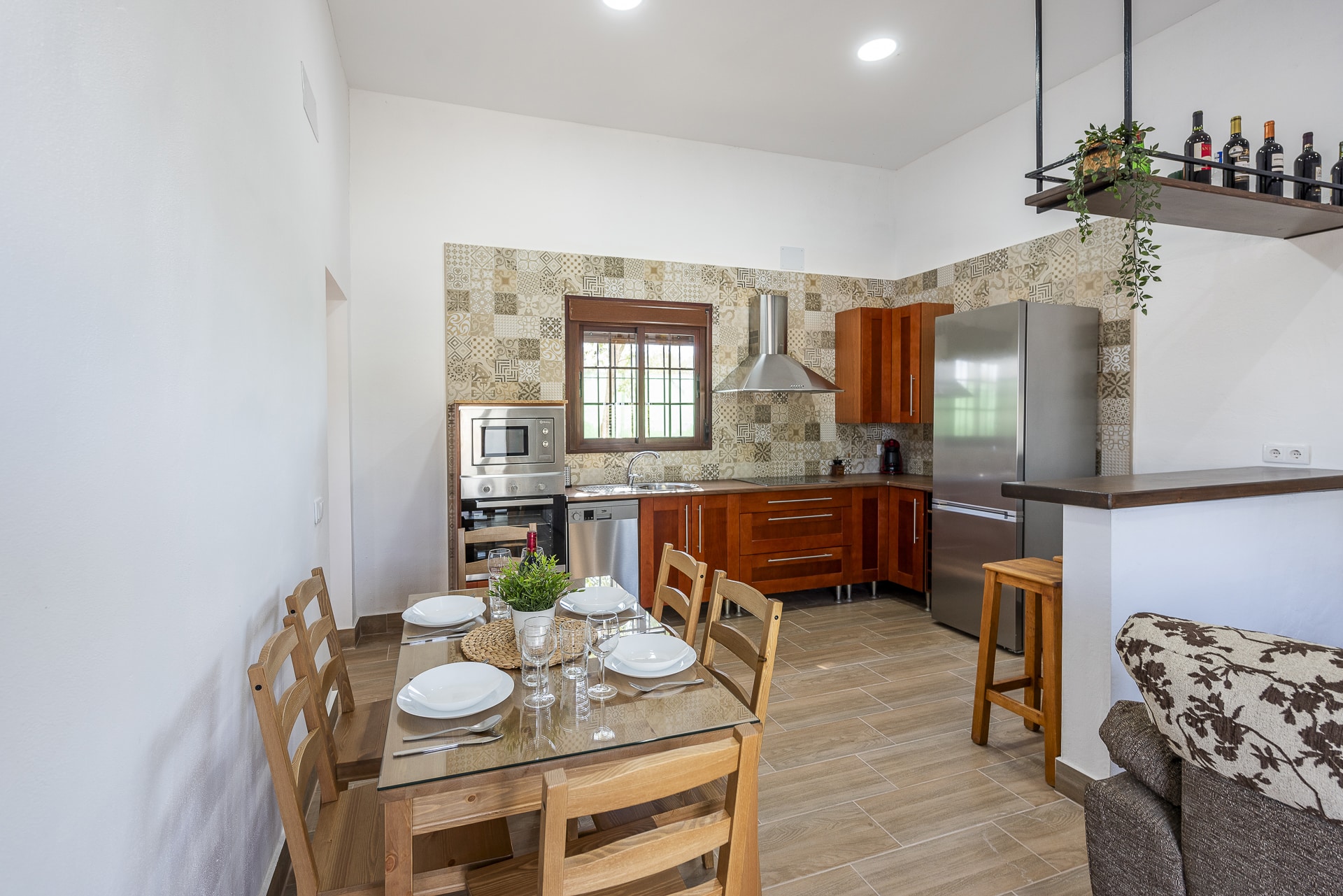 Cocina abierta al salón con barra. Vitrocerámica 4 fuegos, horno, microondas, tostadora, frigoríficos, lavavajillas,…