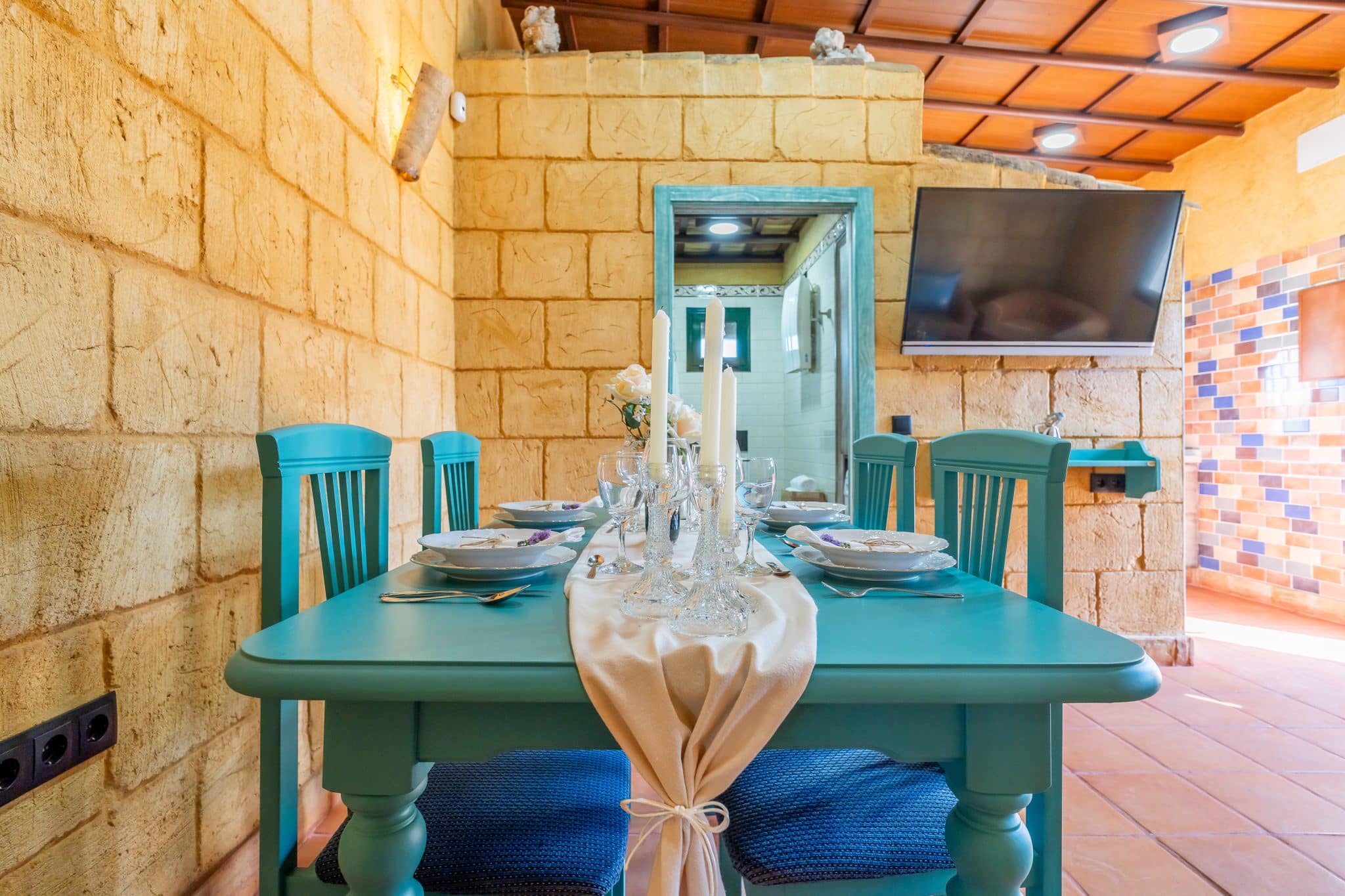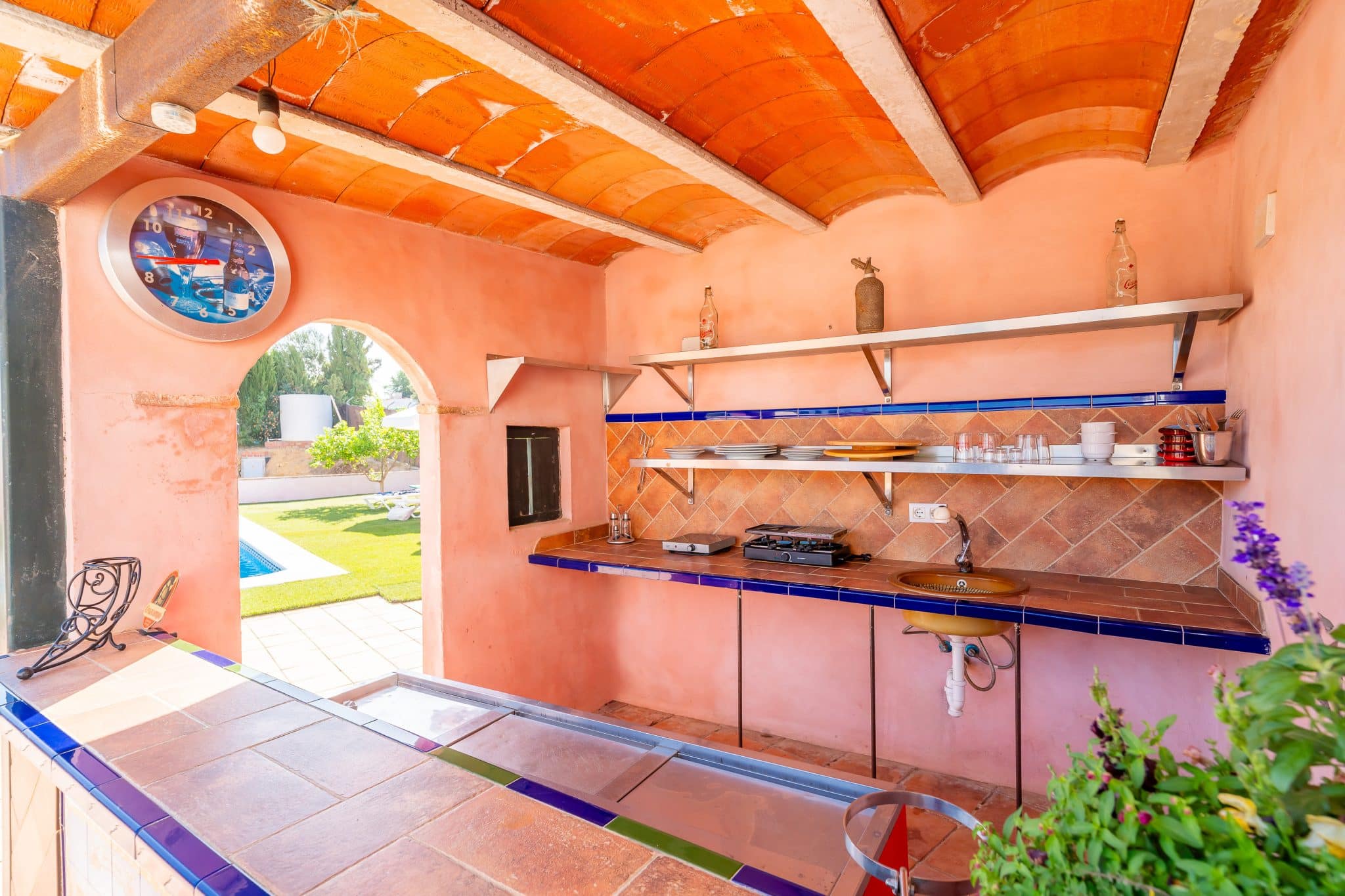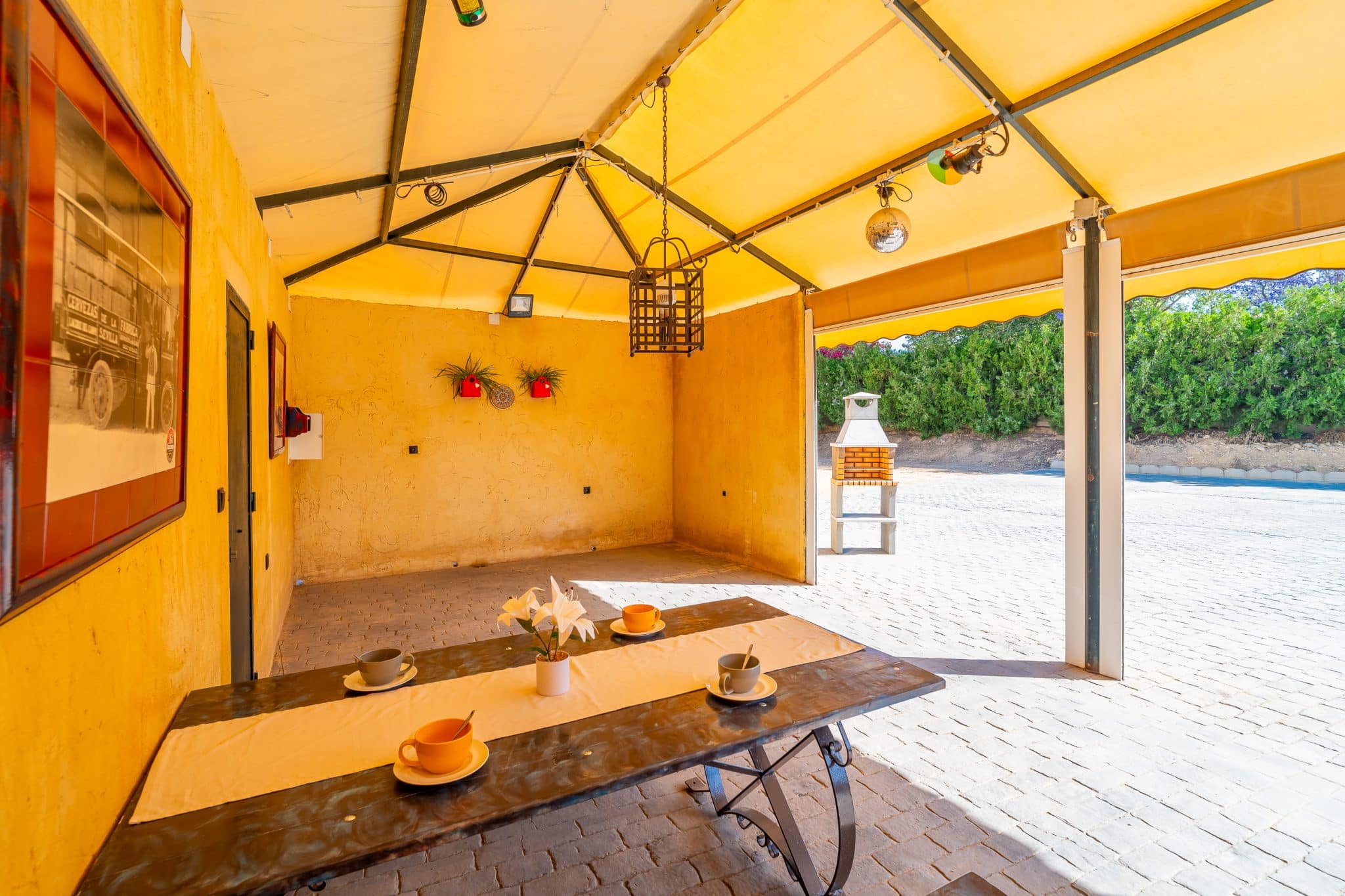 Pérgola con gran mesa, barra bar, plancha carnes y horno para pizzas.