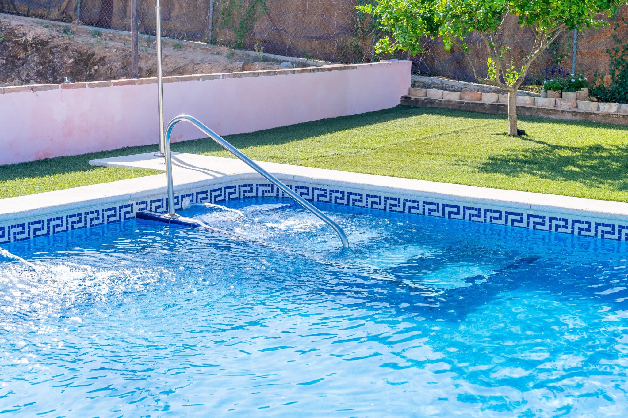 Gran piscina de 9 x 4 metros y 0.90 a 1.35 m. profundidad con escalera de acceso con pasamanos.