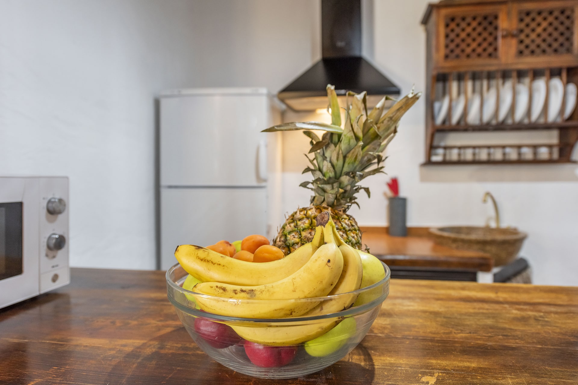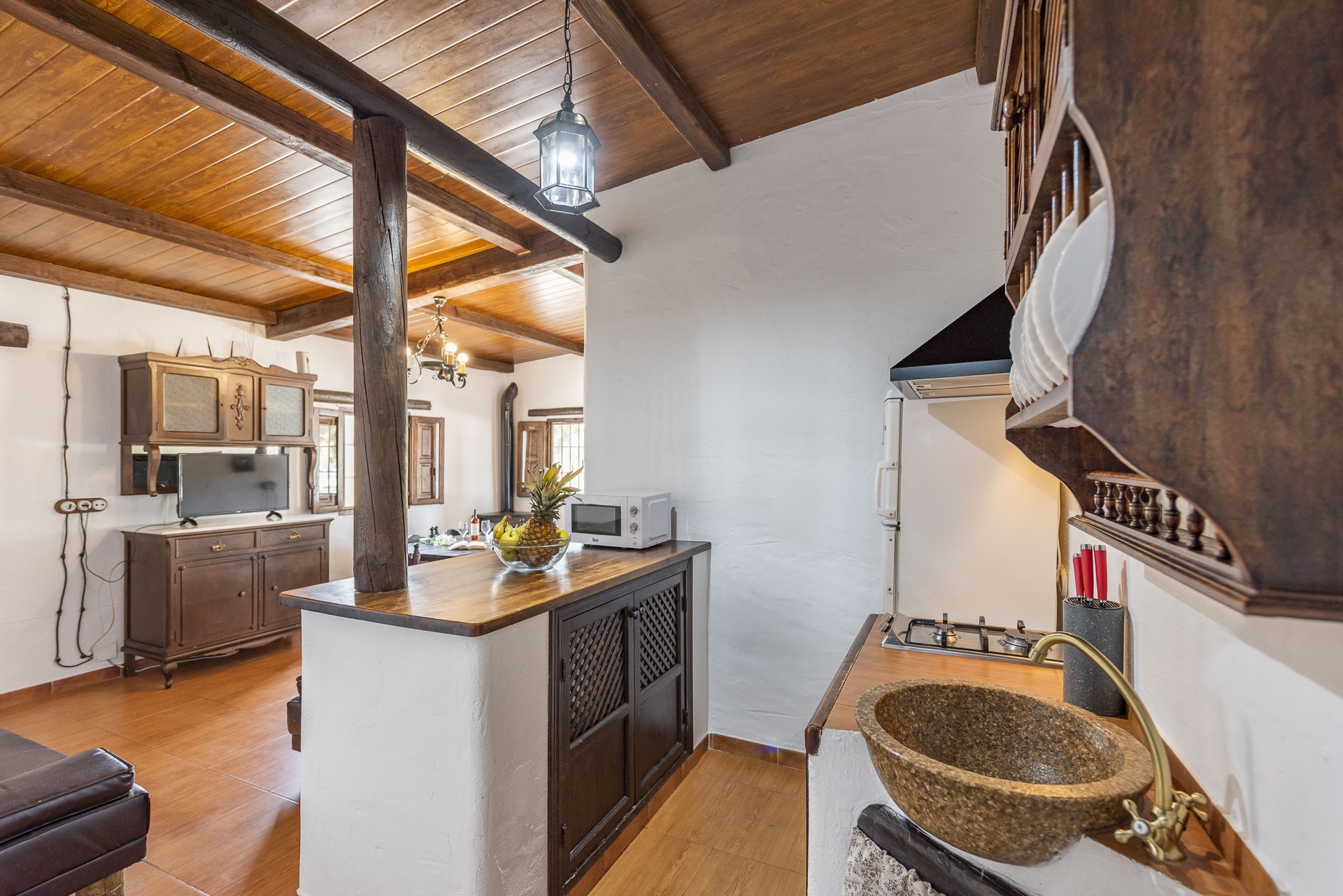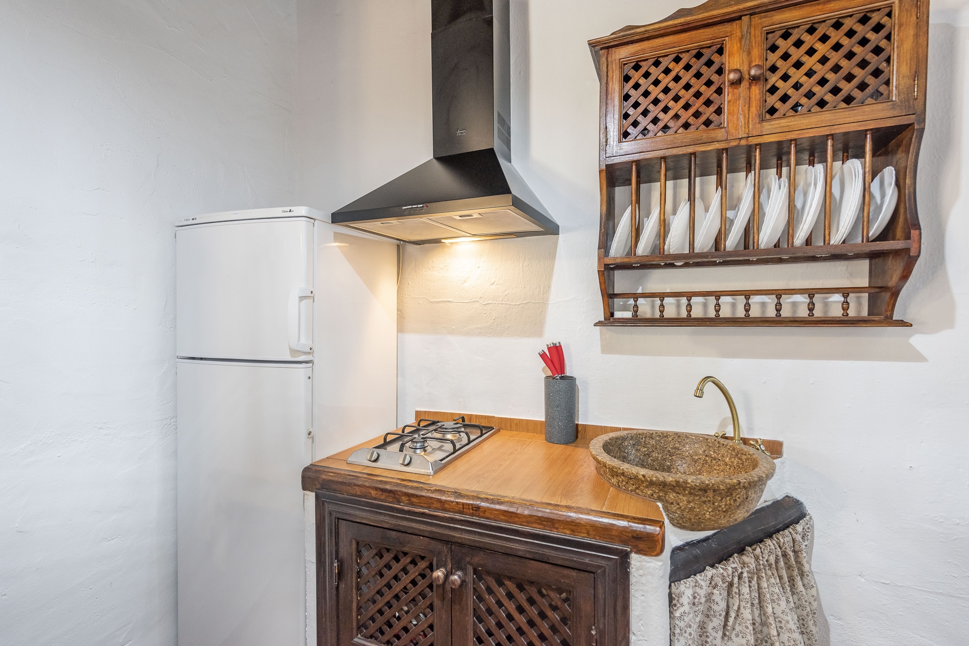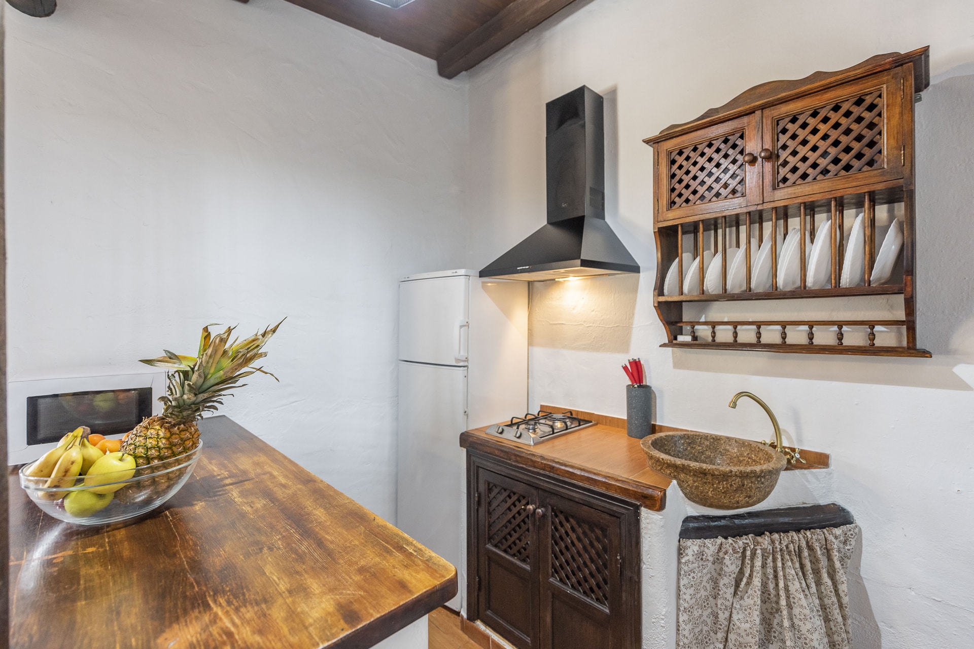 Cocina básica abierta al Salón microondas, cocina 2 fuegos, campana extractora, frigorífico, cafetera,…
