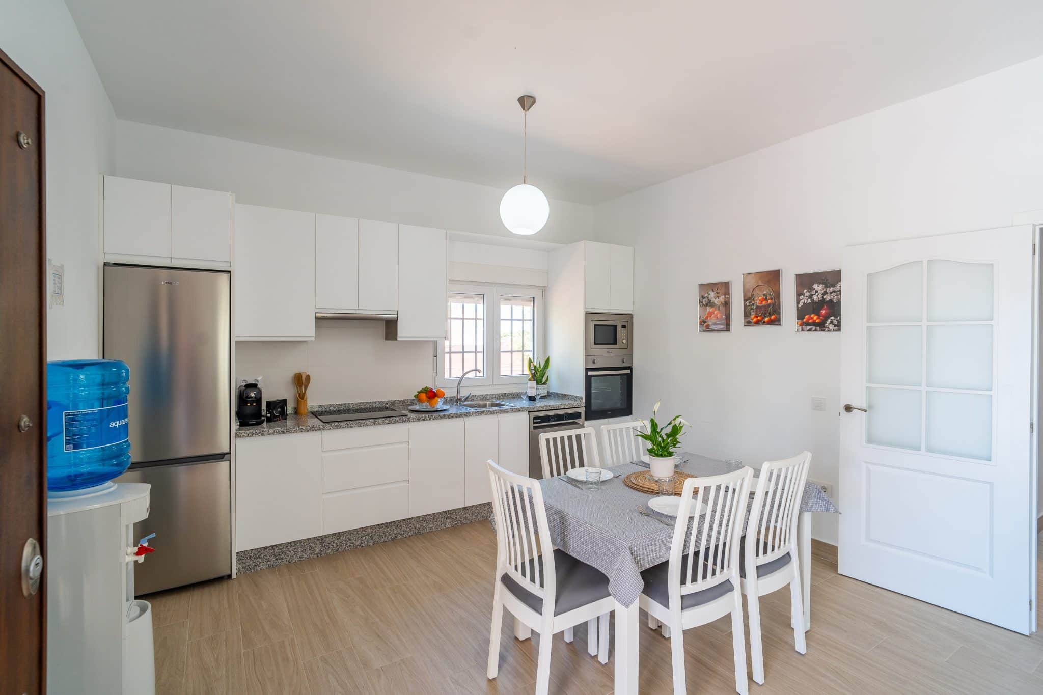 Cocina abierta al salón con vitrocerámica de 3 fuegos, horno, microondas, tostadora, cafetera, frigorífico, lavavajillas…