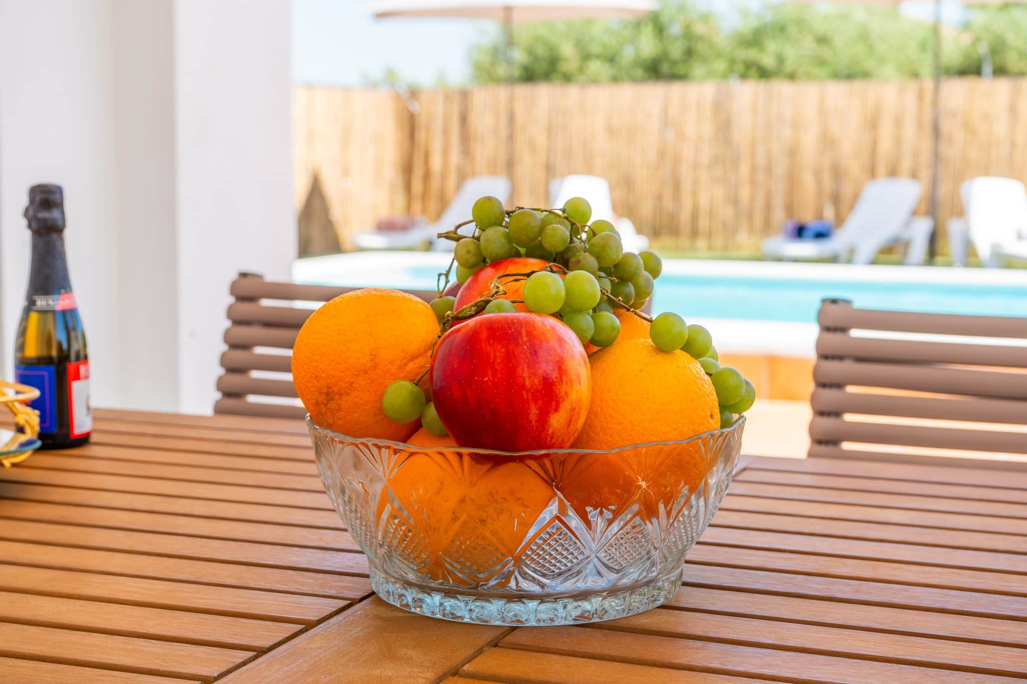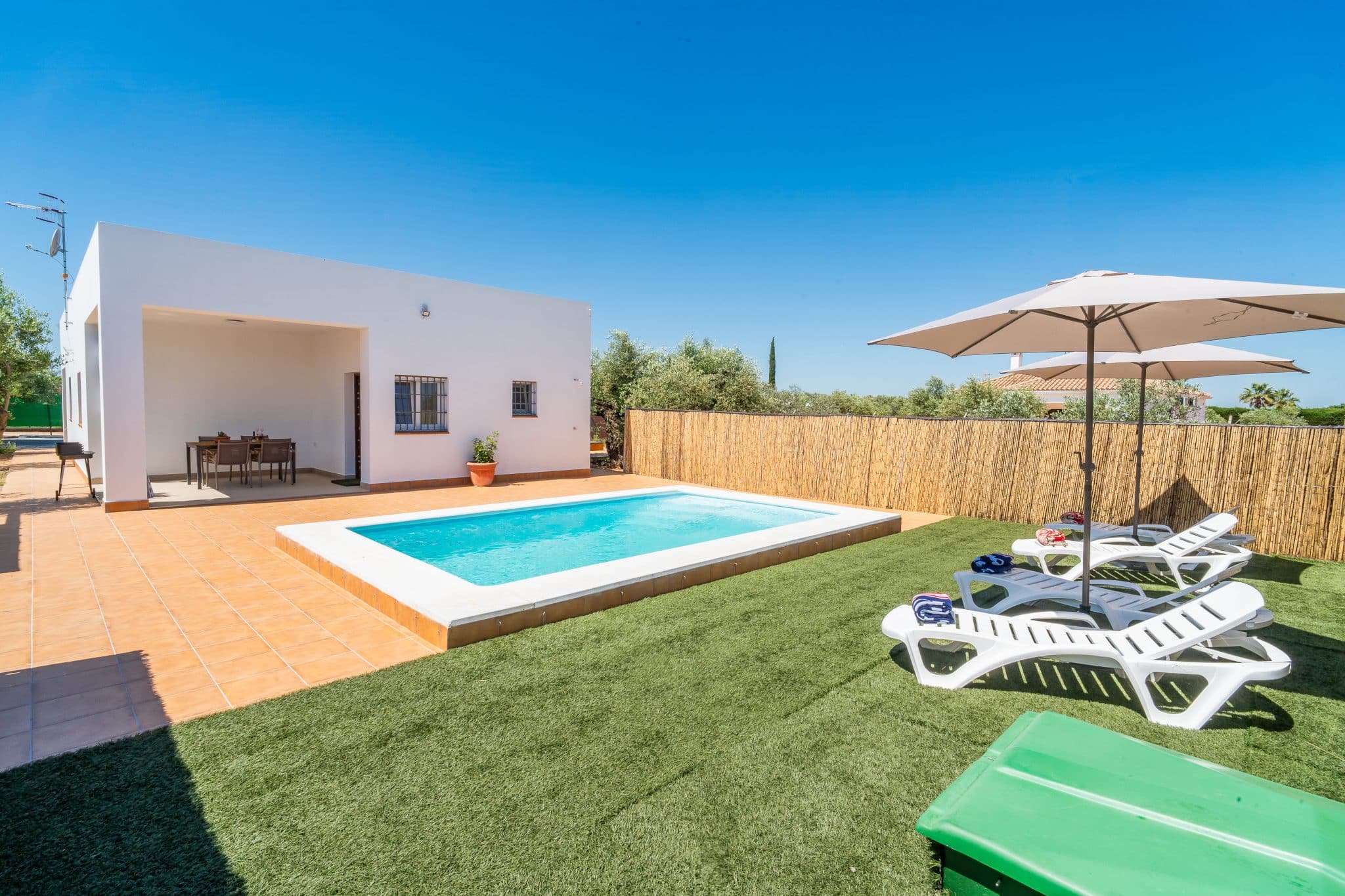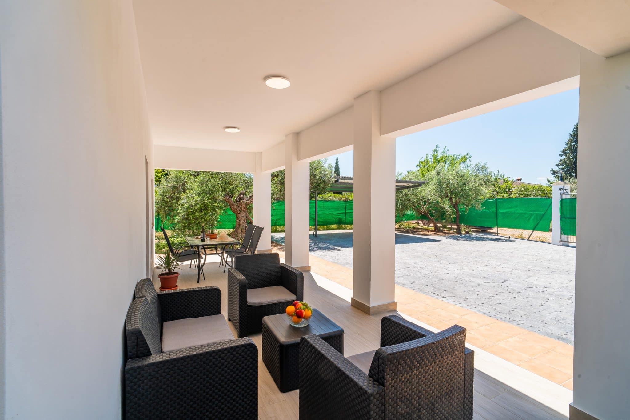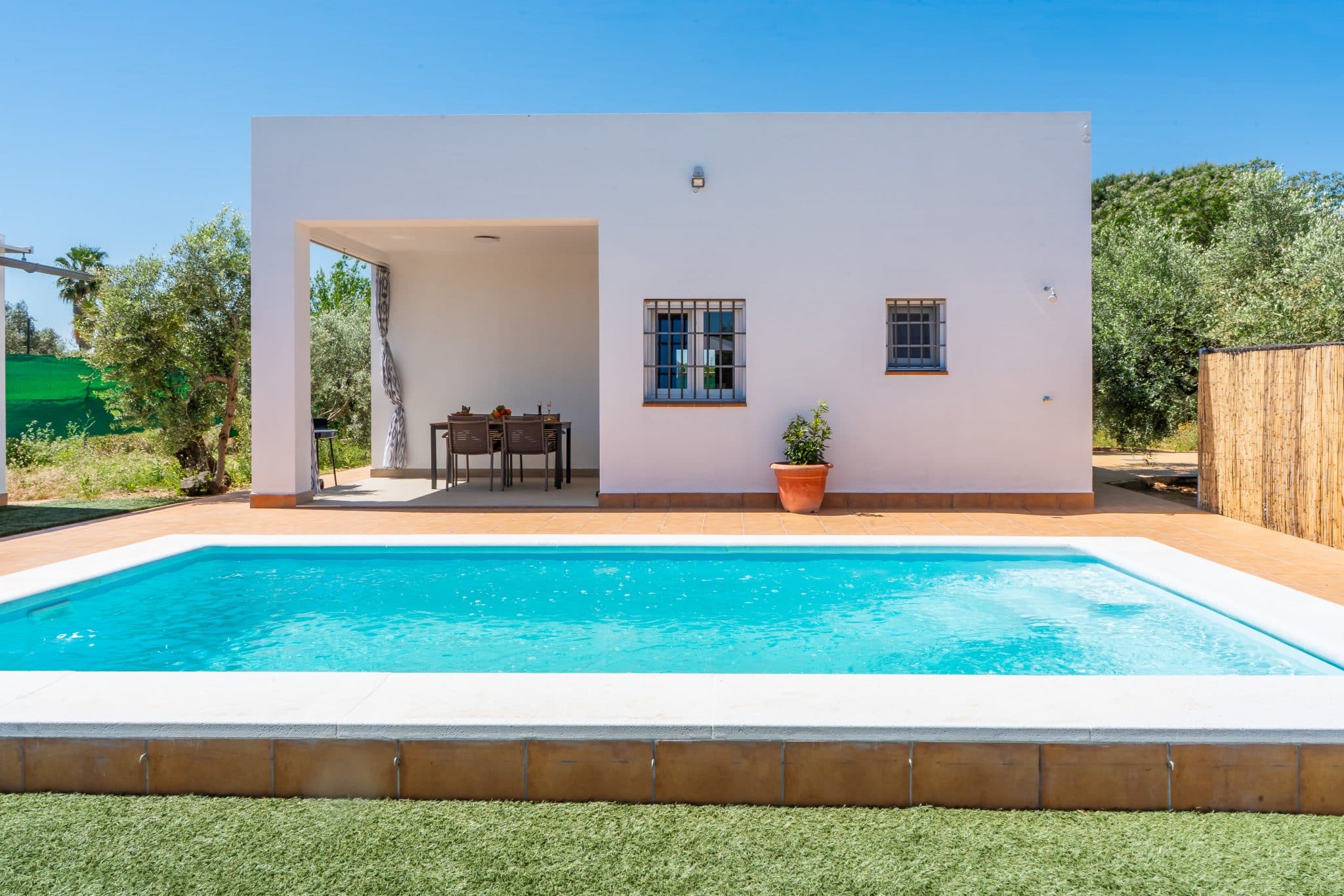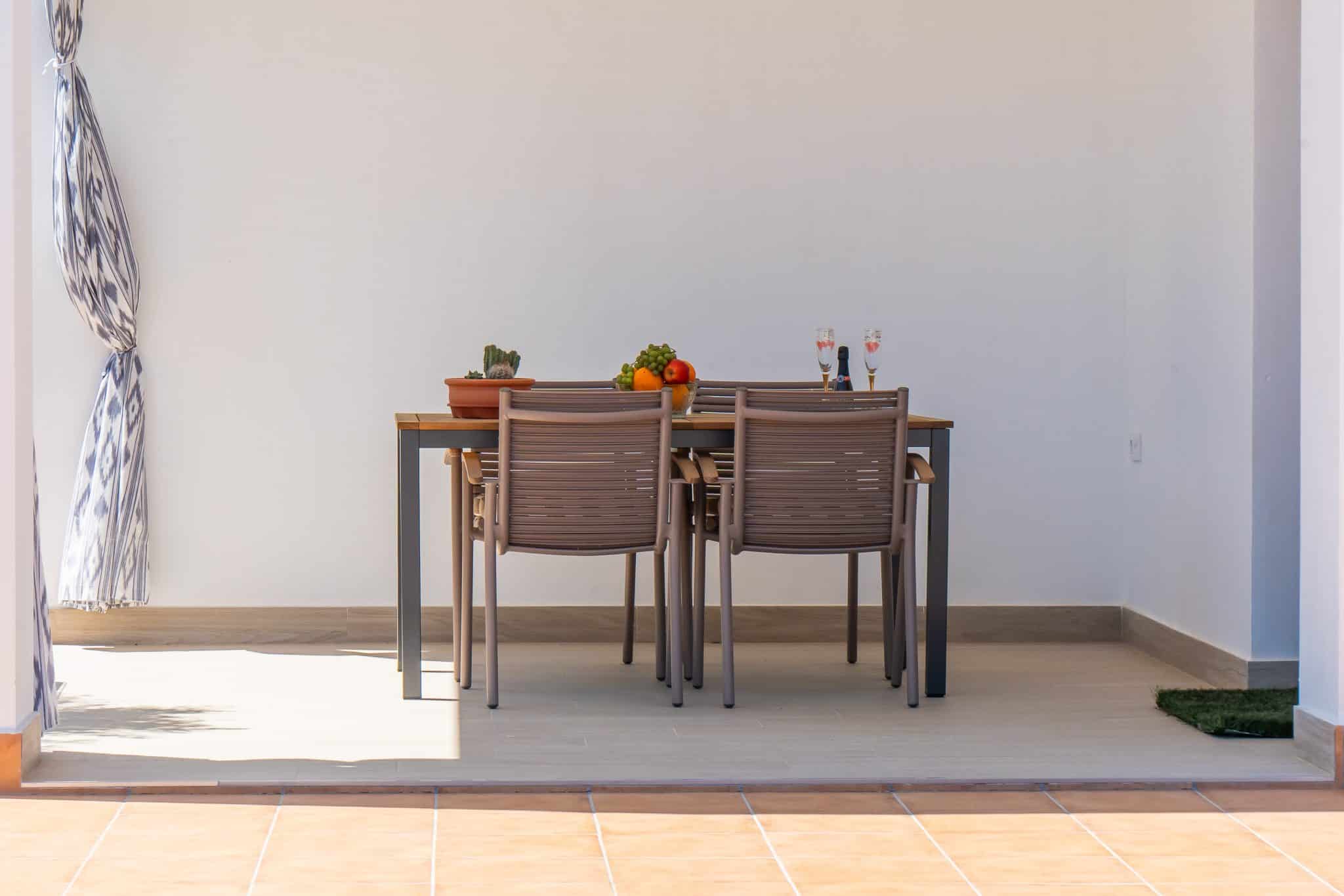 Terraza exterior con porche mirando hacia la piscina