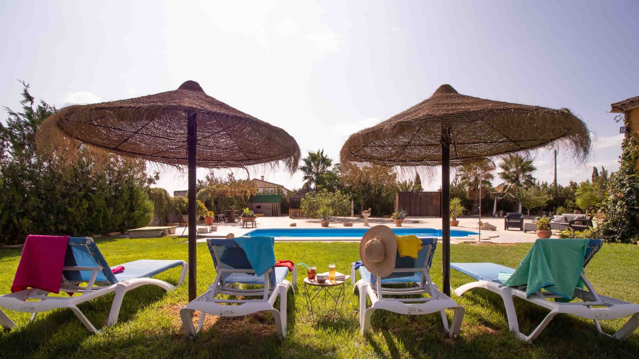 Zona de césped con tumbonas y parasoles. Cuidados rincones de jardin.