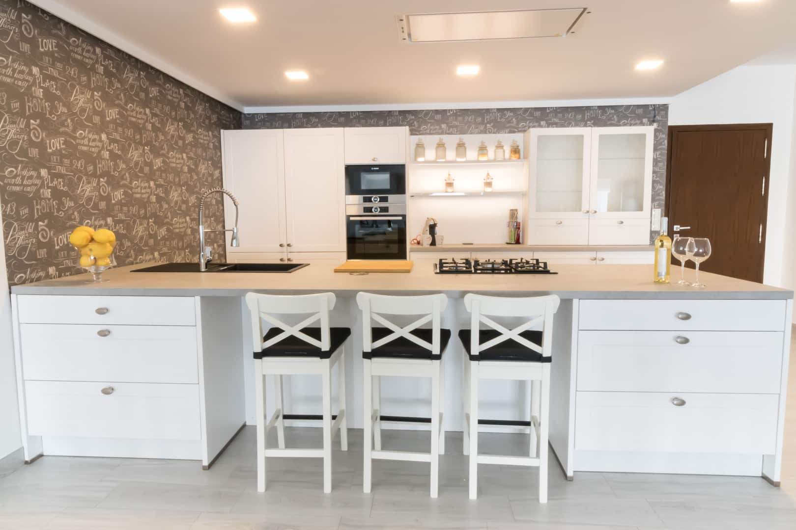 Cocina abierta al salón con isla central. Dispone de cocina 5 fuegos, horno, microondas, cafetera de cápsulas, tostadora, frigorífico, lavavajillas,…