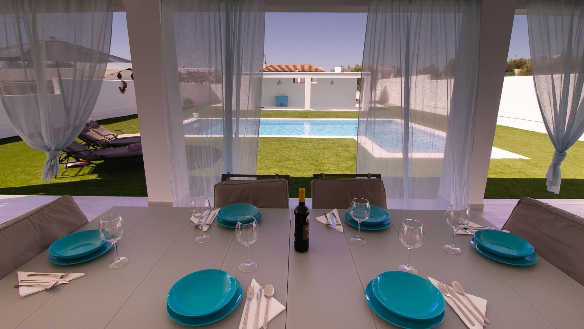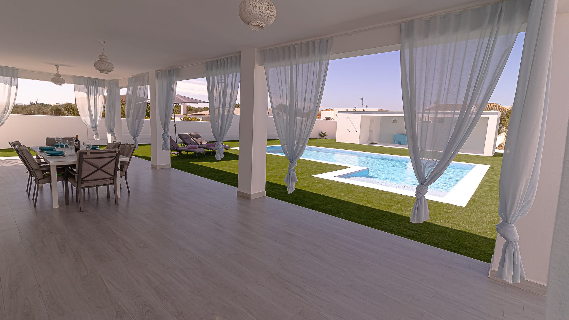 Terraza con porche de 48 m2 mirando hacia la piscina.