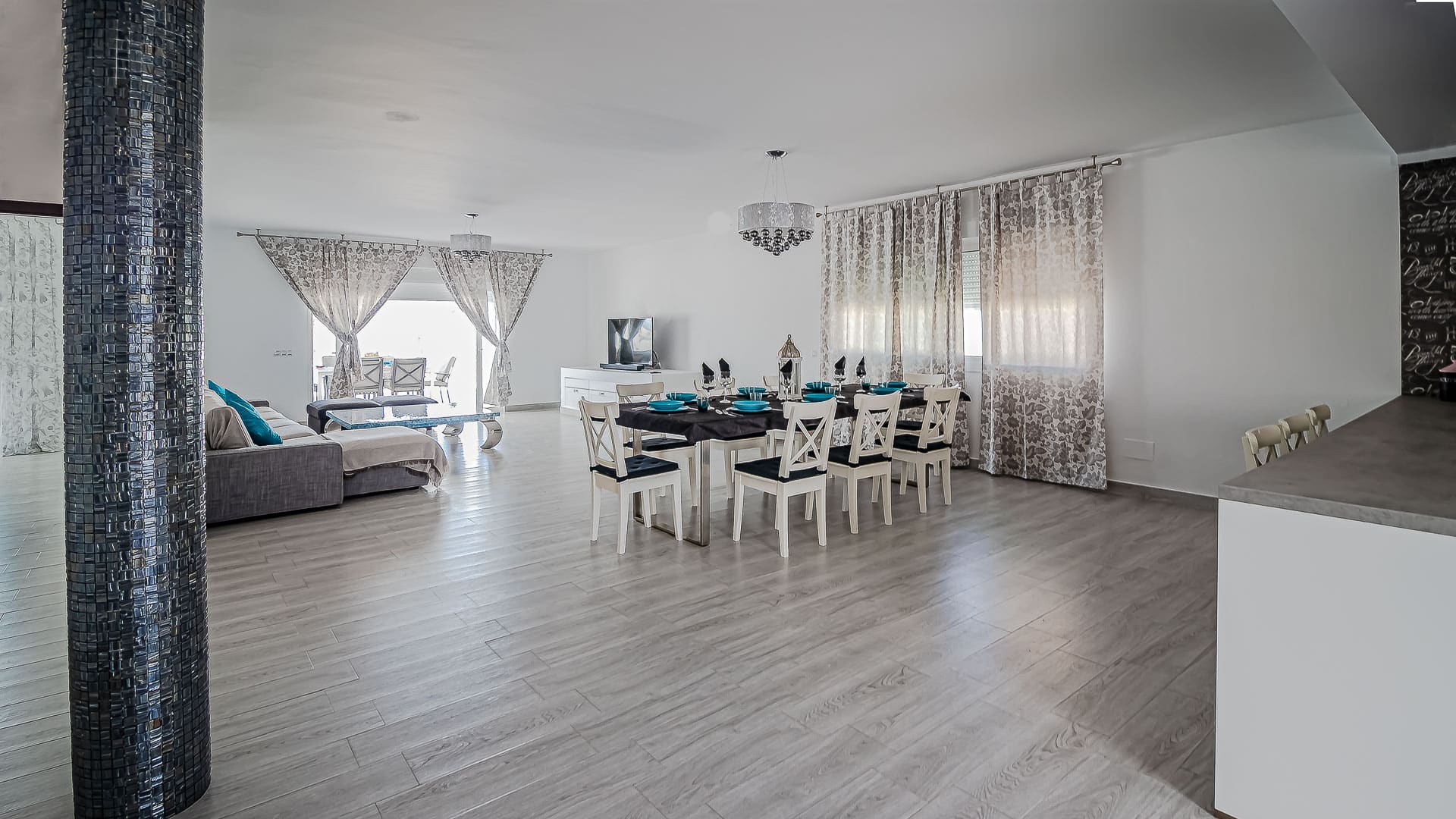 Amplio Salón Comedor con chimenea de 80 m. con acceso directo a gran porche y piscina , TV de 50 pulgadas, Wifi. Aire acondicionado.