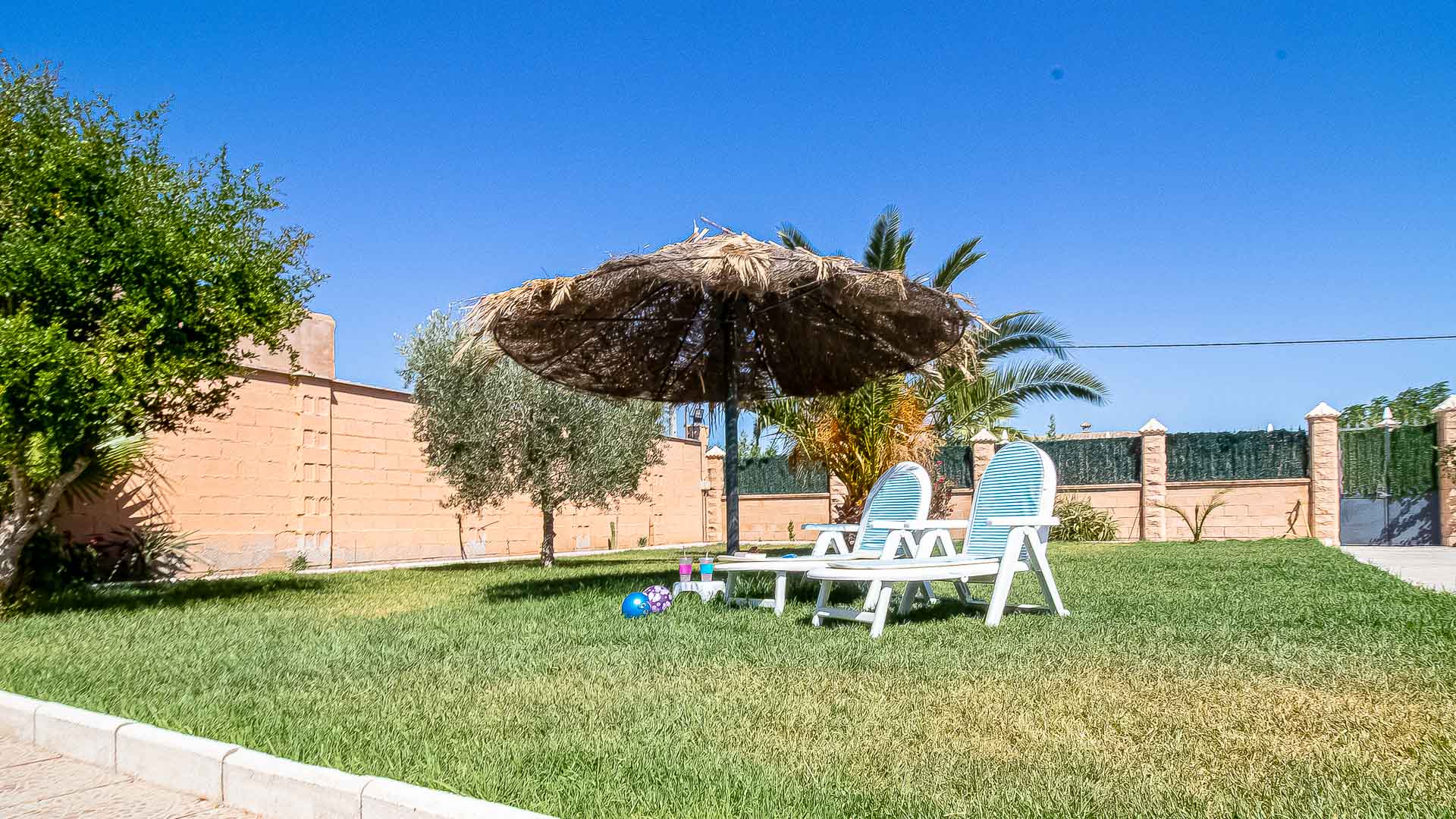 Zona de césped con tumbonas, jardín con árboles y abundantes plantas.