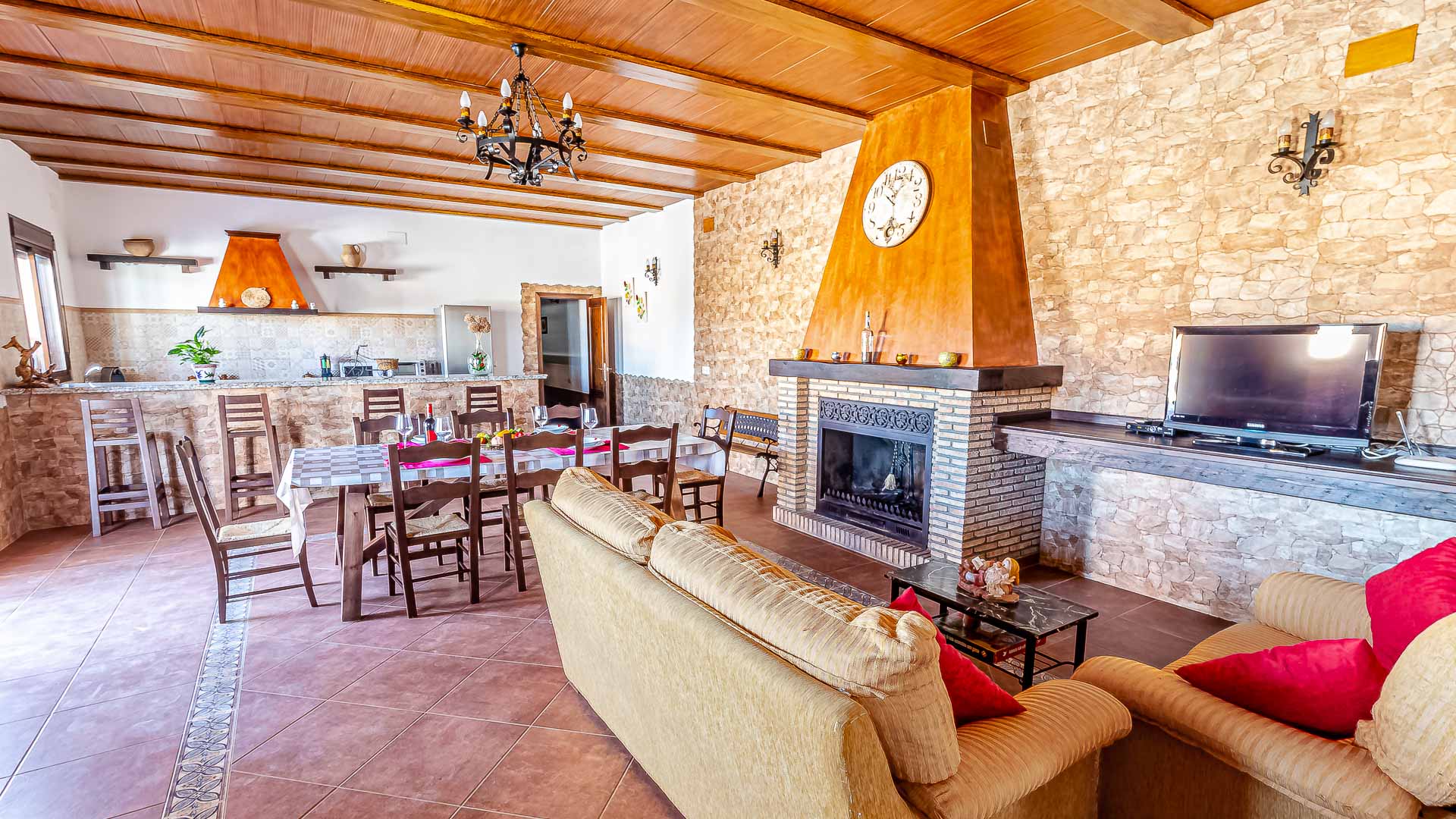 Amplio salón comedor con chimenea. TV canales satélite + Netflix, aire acondicionado, Wifi.