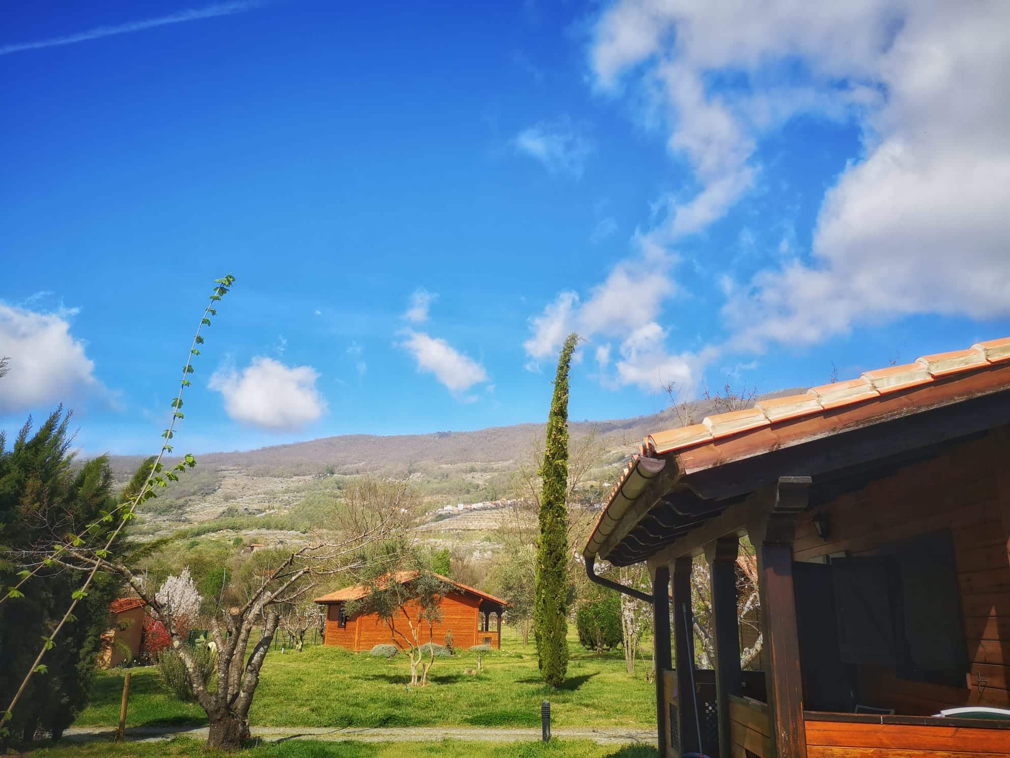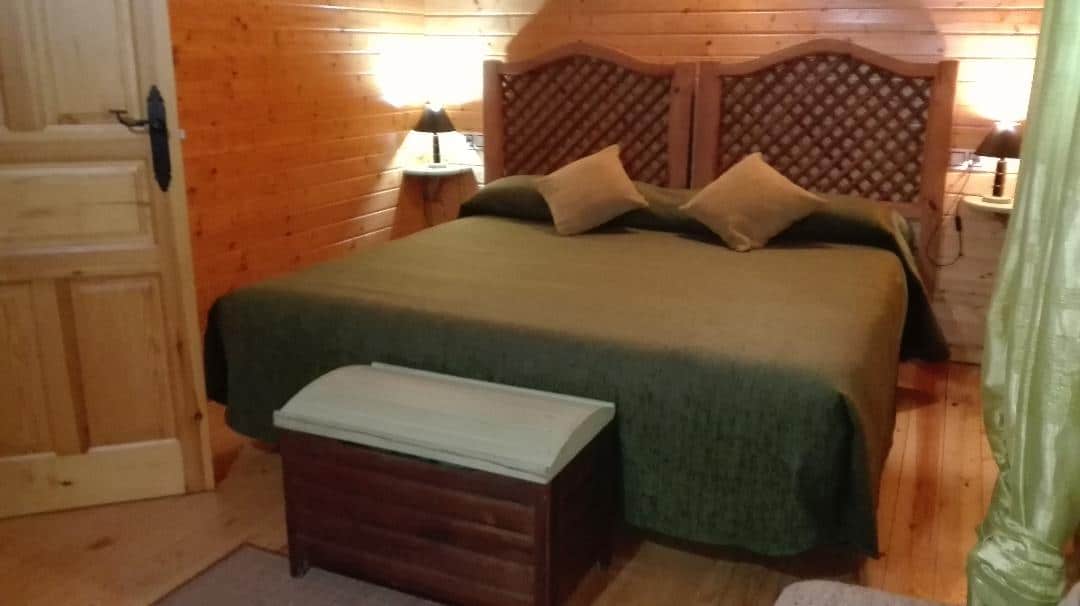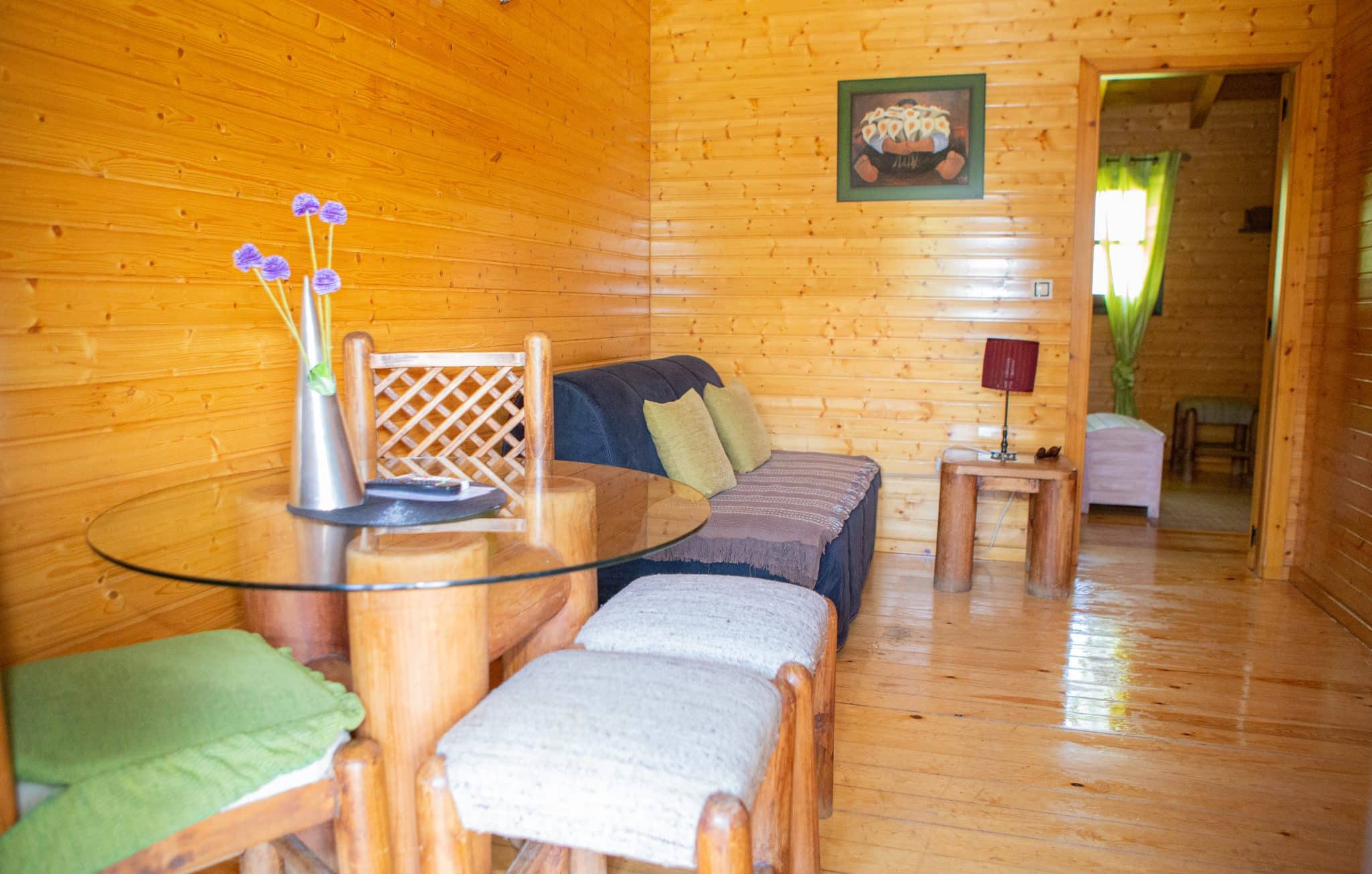 Cabña de madera de 4 plazas con un dormitorio doble y un sofá cama doble en salón. Salón -cocina, 1 cuarto de baño,porche exterior con jardin y aparcamiento