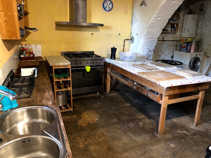 En el comedor hay una chimenea. El patio interior con vueltas (el antiguo corral del rebaño) con barbacoa, horno de leña para asados y “coques de recapte” para comidas al atardecer y canciones cerca del fuego. La comida basada en la huerta de casa y cuatro cosas compradas de confianza a vecinos que lo hacen bueno.